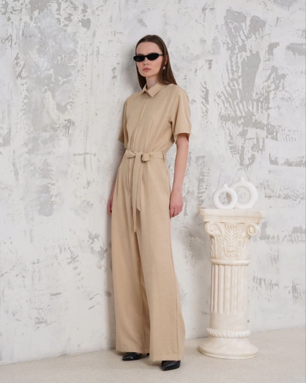 Kuşaklı gömlek yaka salaş tulum bej s255822
