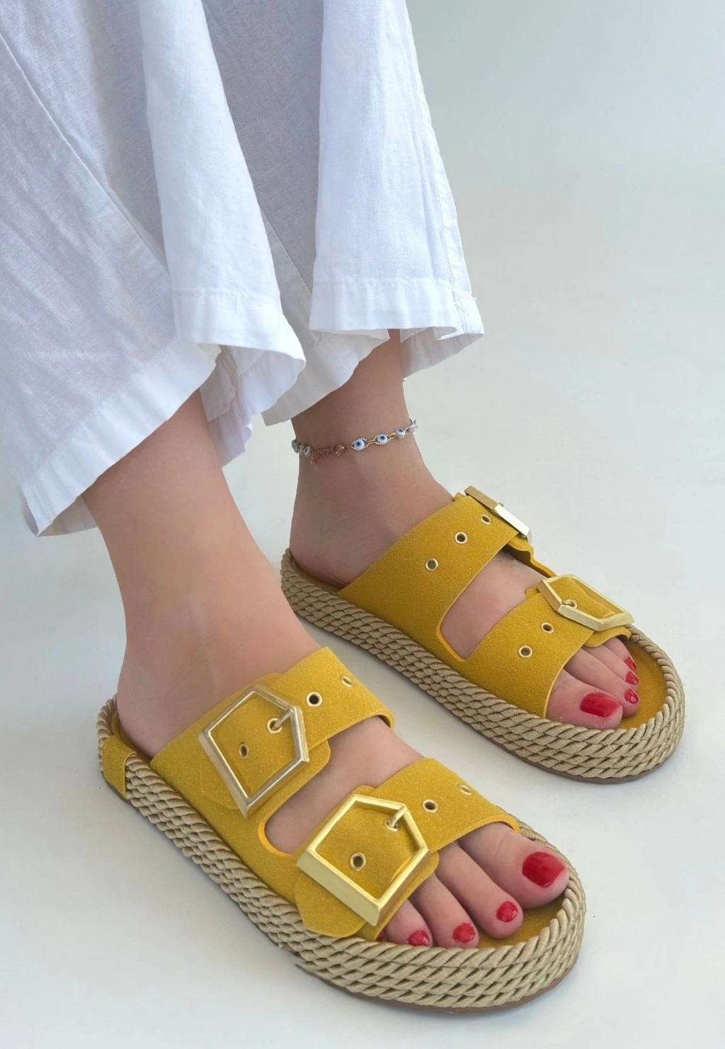 Loera Sarı Nubuk Çift Tokalı Terlik