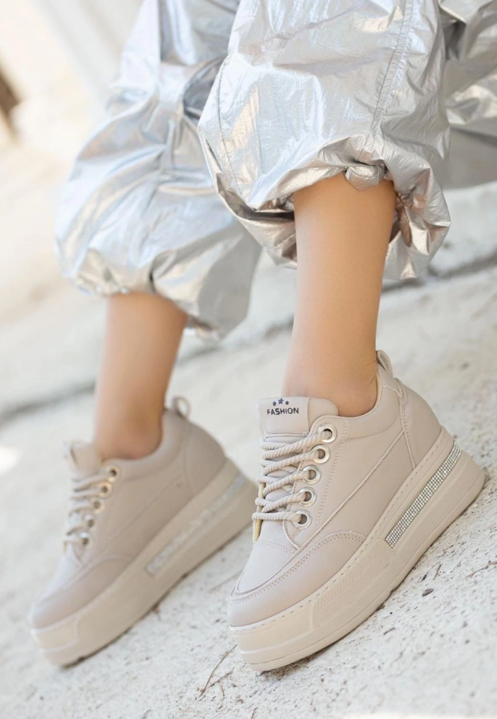 Lulu Bej Cilt Bağcıklı Spor Ayakkabı