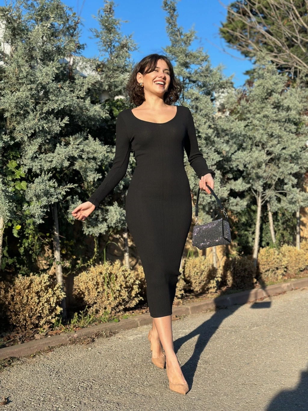 V yaka Uzun kollu midi boy elbise siyah A3154