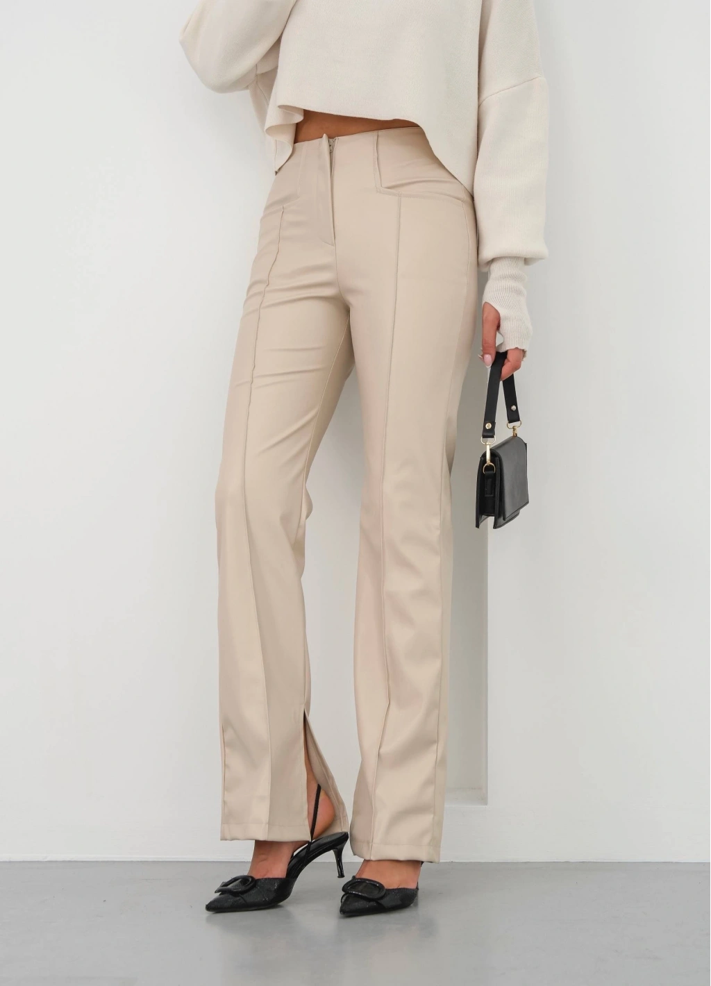 • İspanyol yırtmaçlı paça deri pantolon bej hn