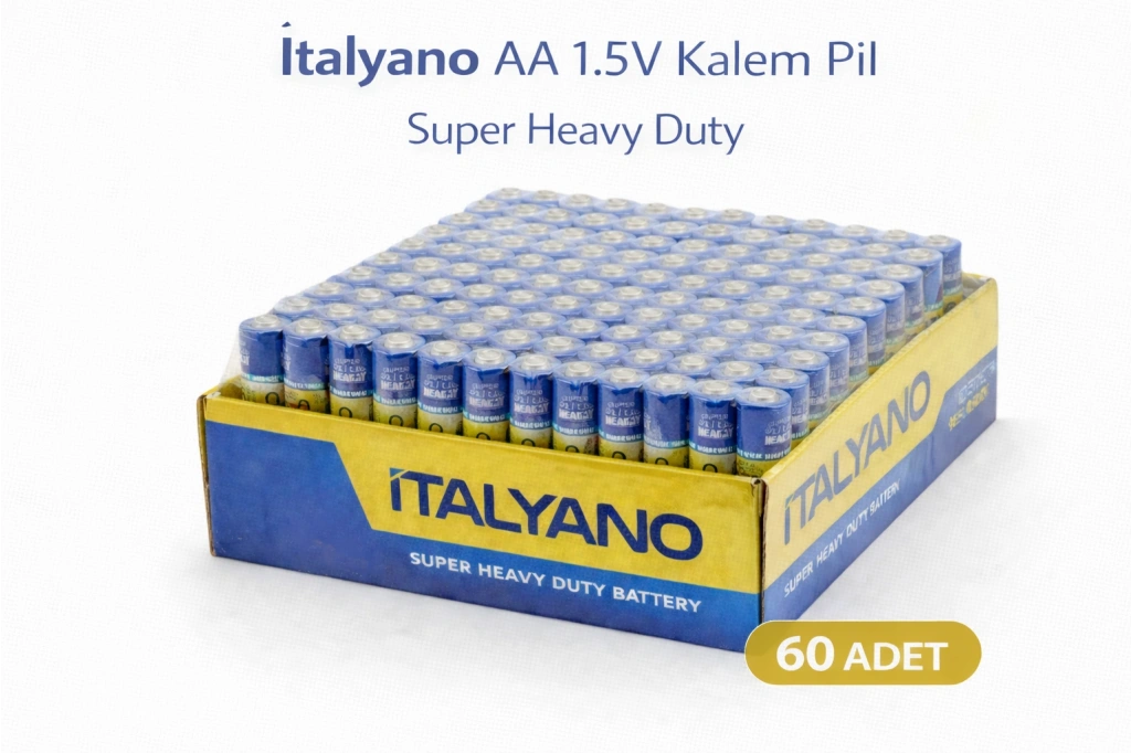 İtalyano AA 1.5V Kalem Pil, günlük kullanım için geliştirilmiş Super Heavy Duty yapıya sahiptir. Uzaktan kumanda, duvar saati, oyuncak, el feneri, mouse, klavye ve küçük ev aletleri gibi birçok elektronik cihazda güvenle kullanılabilir.
