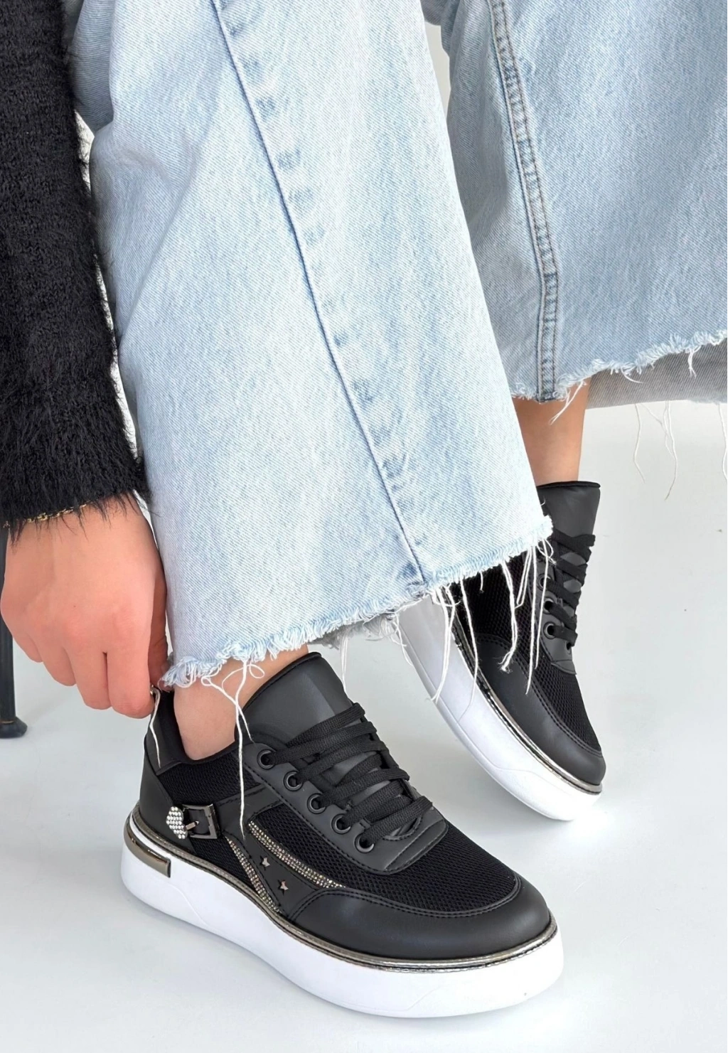 Junda Siyah Cilt Bağcıklı Spor Ayakkabı