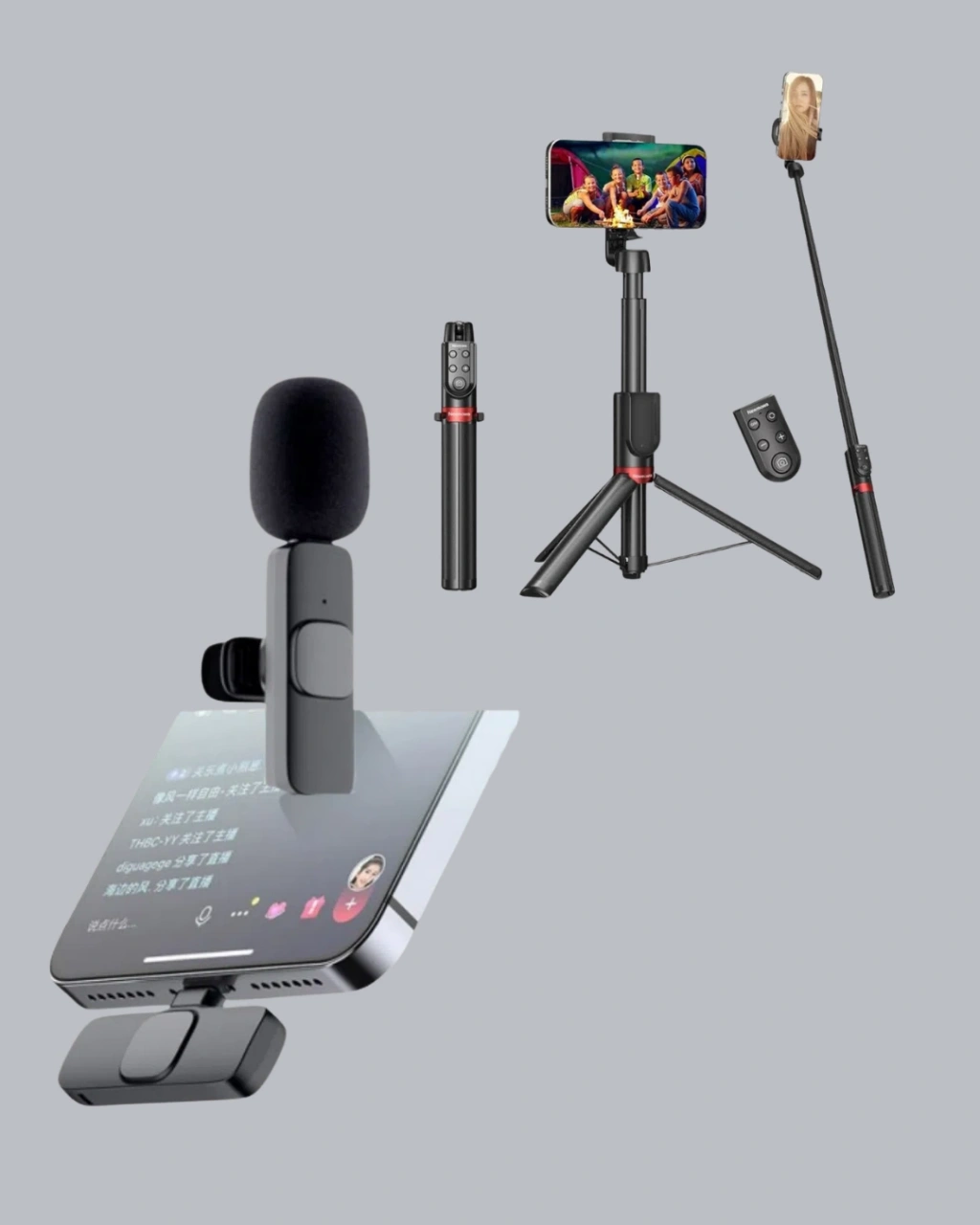 Bu set, profesyonel ses ve stabil görüntü arayan içerik üreticileri için özel olarak bir araya getirilmiştir. Çift mikrofonlu kablosuz yaka mikrofonu sistemi, iki konuşmacının bulunduğu çekimlerde dahi net ve dengeli ses kaydı alınmasını sağlar. iPhone cihazlarla tam uyumlu yapısı sayesinde alıcıyı Lightning girişine takmanız yeterlidir; mikrofonlar otomatik olarak bağlanır ve saniyeler içinde kullanıma hazır hâle gelir.360 derece ses alma teknolojisi ve gelişmiş gürültü azaltma sistemi sayesinde rüzgâr, ortam uğultusu ve arka plan sesleri filtrelenerek temiz ve berrak bir ses elde edilir. Tripodlu selfie çubuğu ise uzatılabilir gövdesi ve tripod ayakları sayesinde titreşimsiz ve stabil çekimler sunar. Uzaktan kumanda desteği ile fotoğraf ve video çekimleri daha pratik hale gelir.