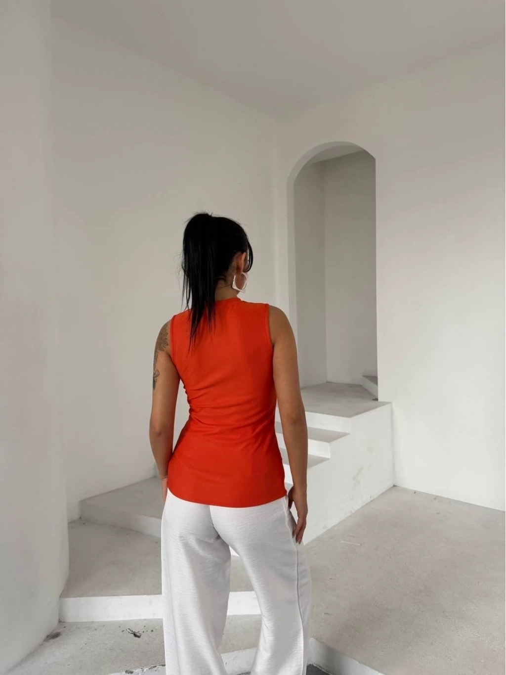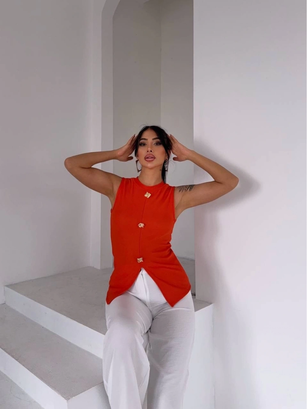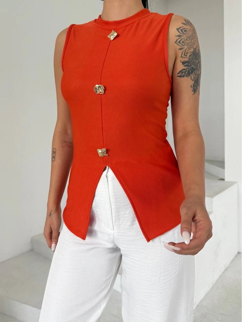 Özel tasarım gold düğmeler bluza şık bir hava katarken, turuncu rengi ise enerjik ve canlı bir görünüm sunar.