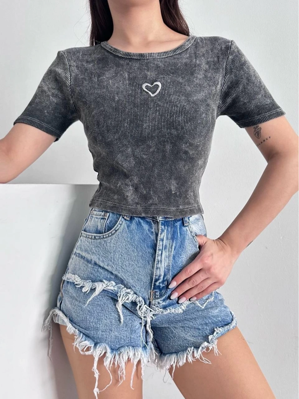 • Kalp nakışlı asit yıkamalı bluz s3479