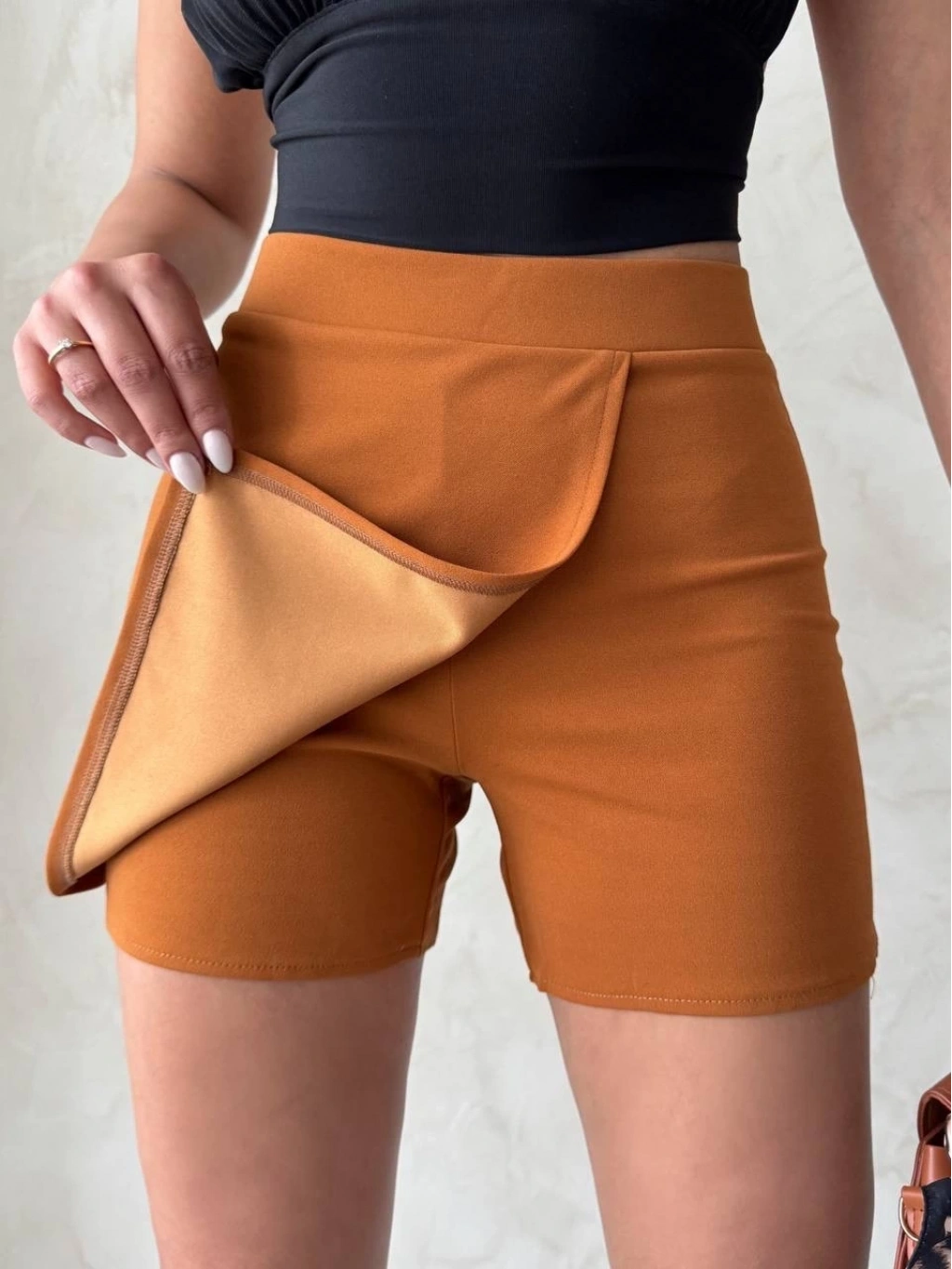 Kombinlerinize kolayca uyum sağlayacak olan Kapaklı Şort Etek Camel S208, gardırobunuzun vazgeçilmezi olmaya aday.