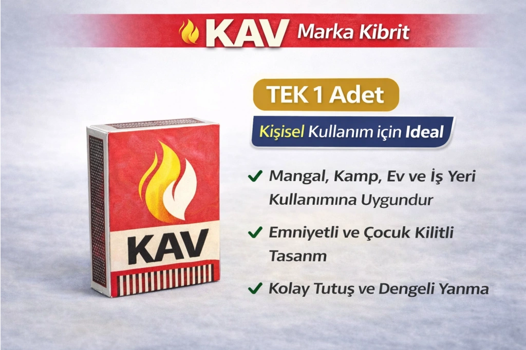 KAV marka kibrit, günlük kullanım için pratik ve güvenli bir ateşleme çözümüdür. Emniyetli kibrit yapısı sayesinde yalnızca kutu üzerindeki özel yüzeyde yanar ve kontrollü kullanım sağlar. Ev, iş yeri, kamp, mangal ve mutfak kullanımı için uygundur.