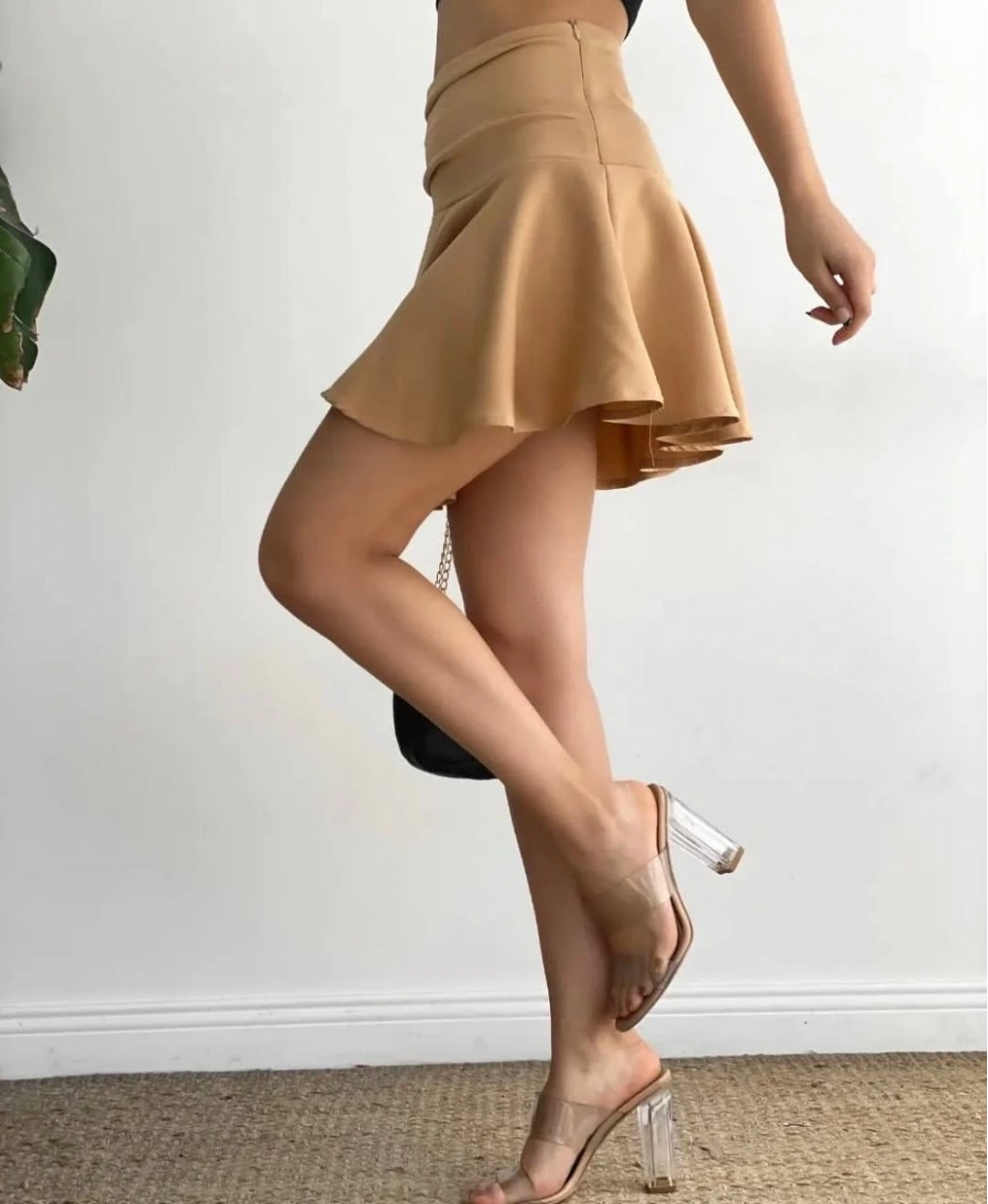 Kemerden büzgülü etek camel, stilinizi tamamlayacak şık bir seçenektir.