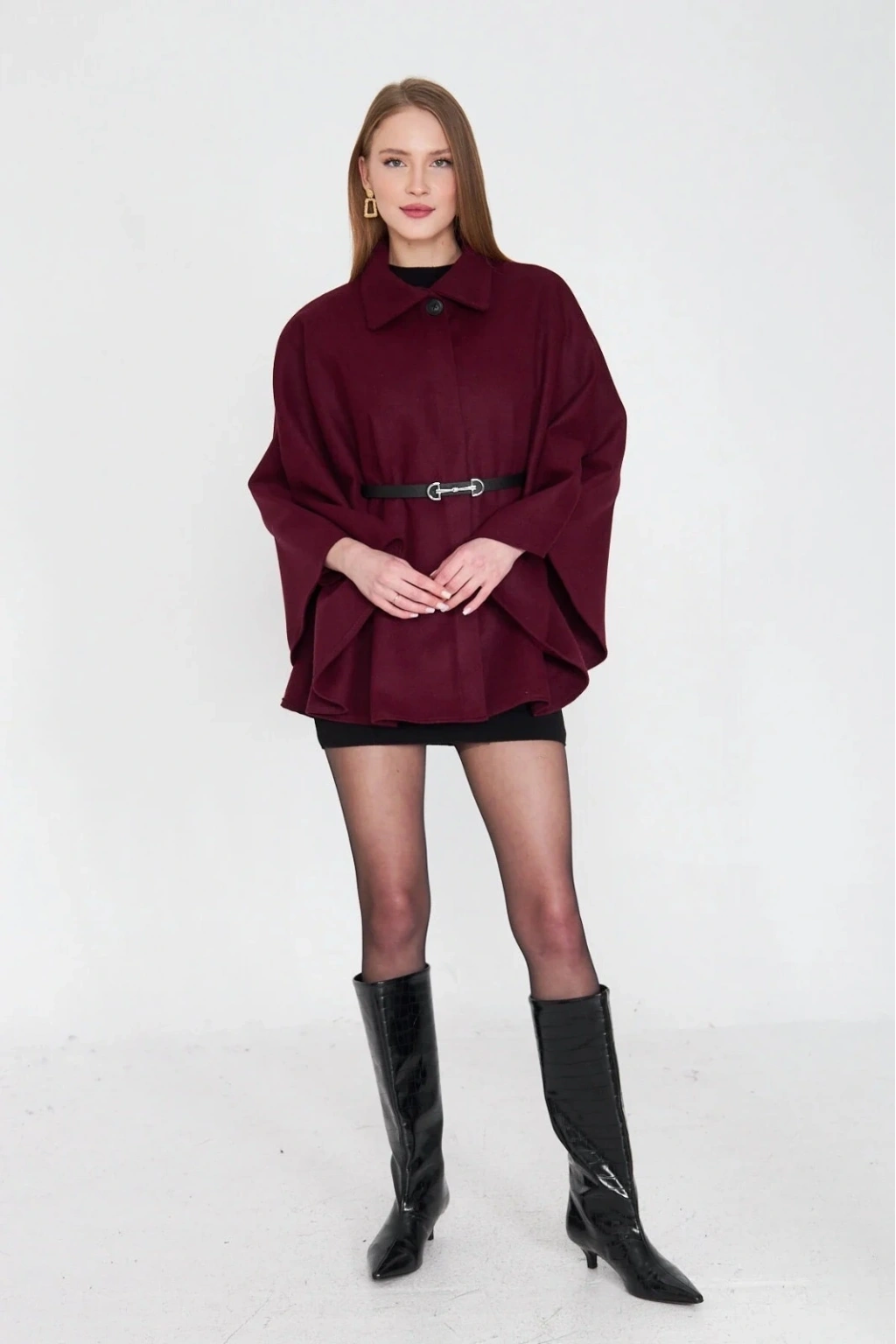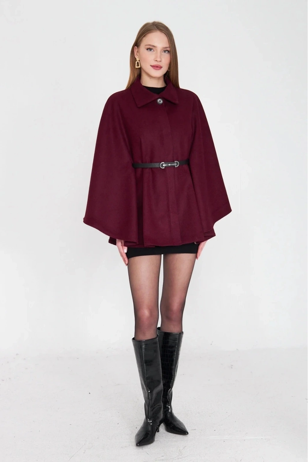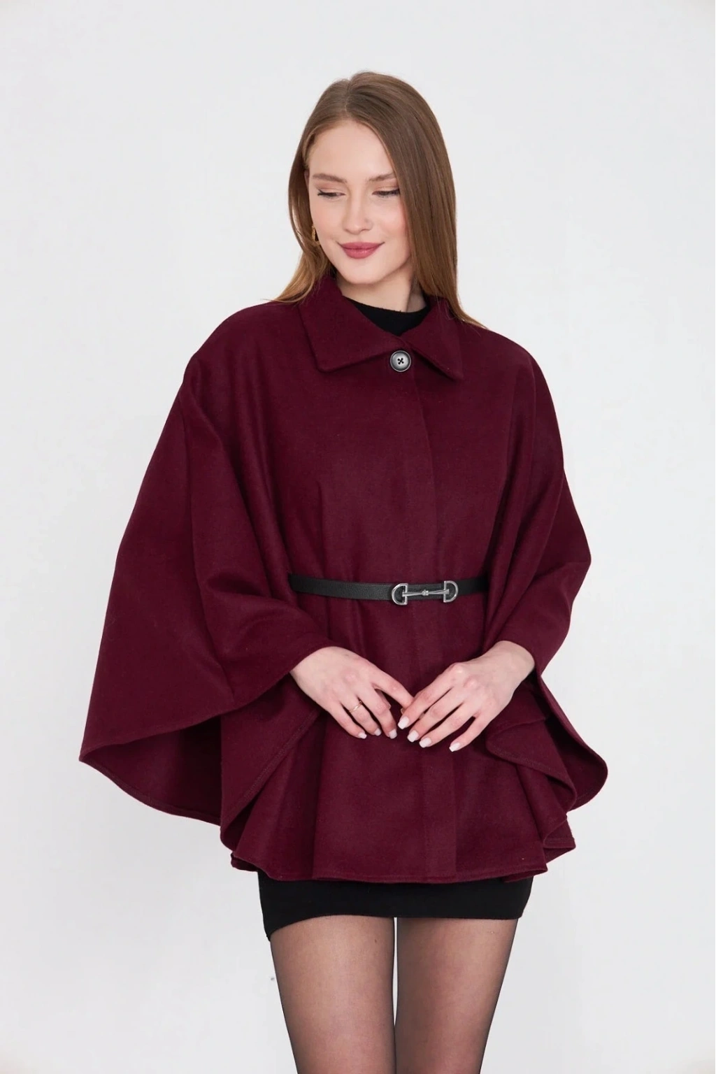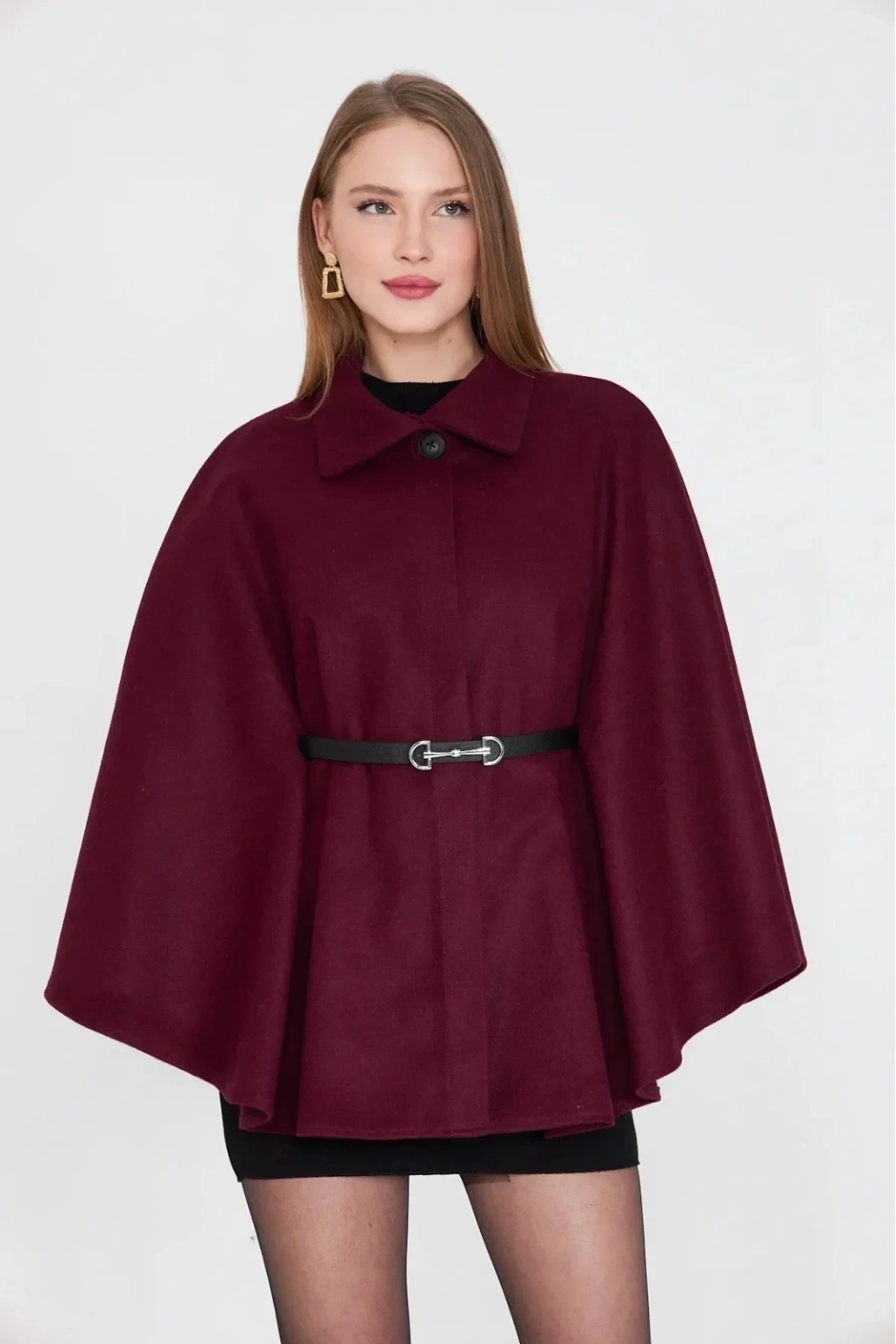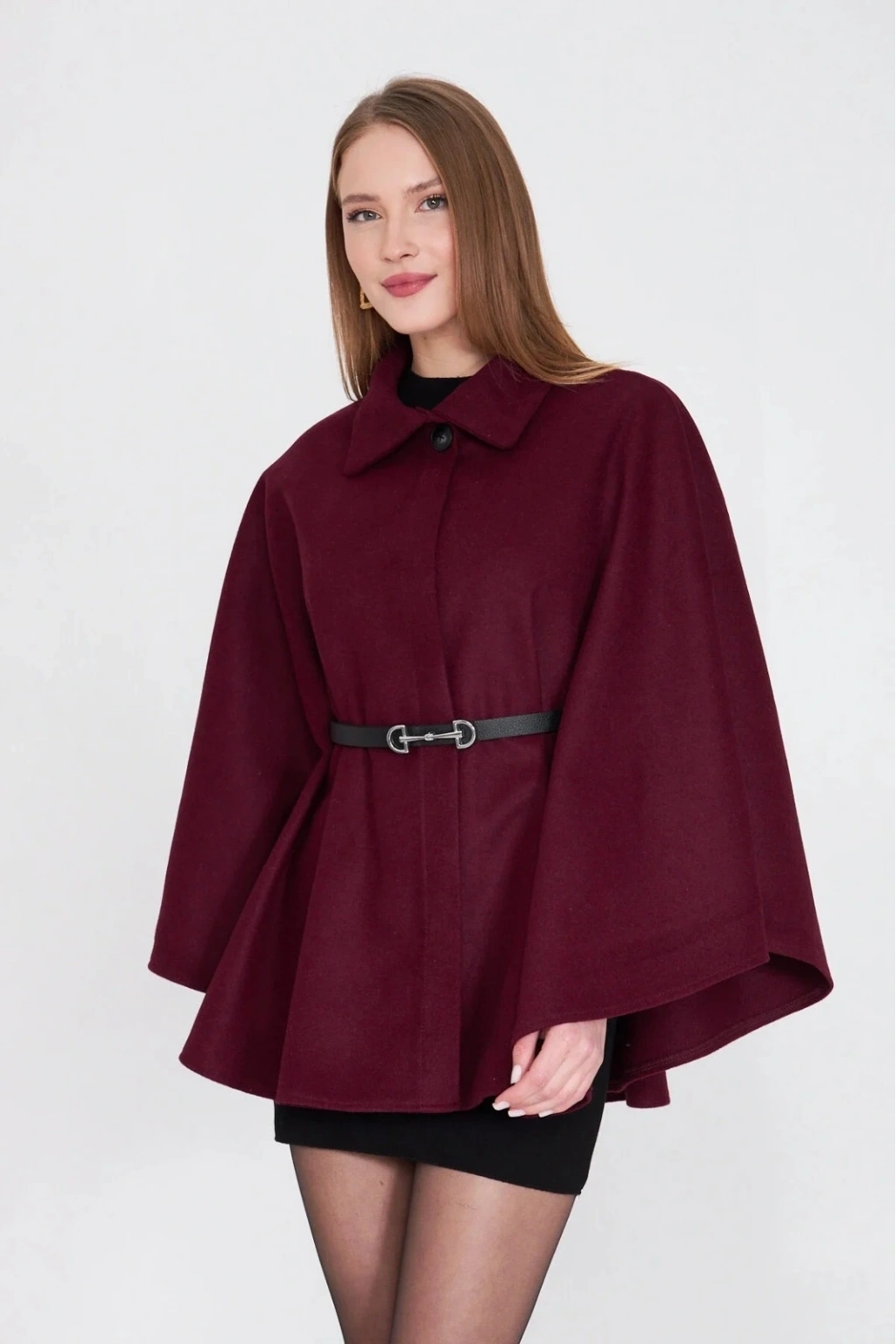 Bu kışın vazgeçilmezi olmaya aday kemerli kaşe panço bordo, şıklığınızı tamamlayacak bir parça.