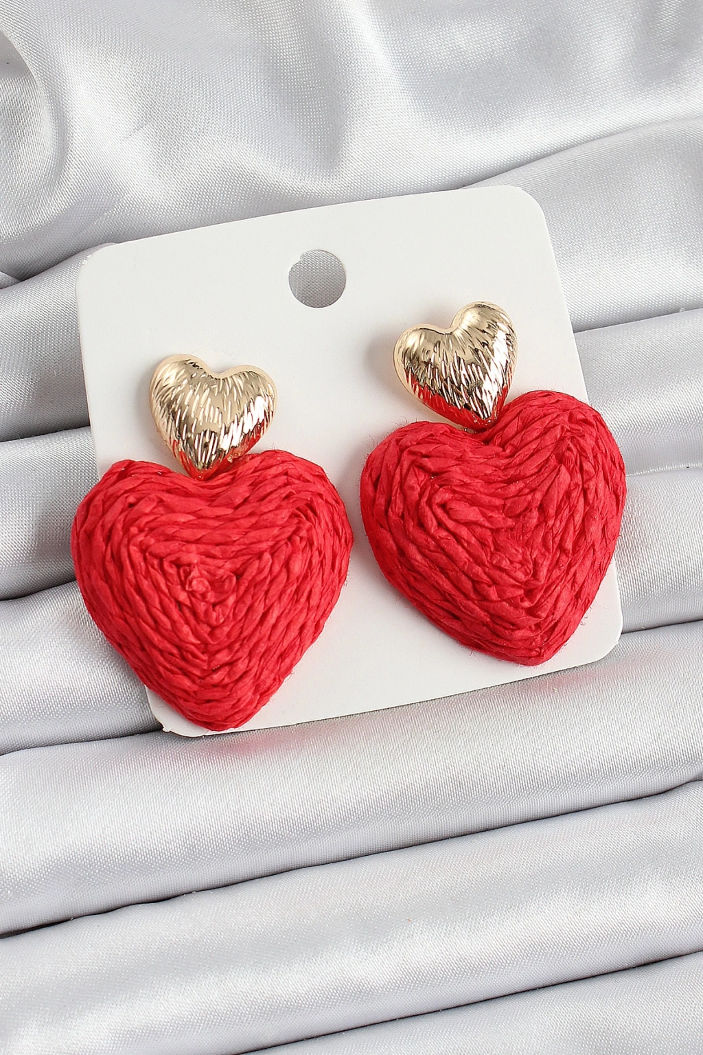 Kırmızı Kalp Figürlü Hasır Örgü Model Gold Renk Kadın Küpe