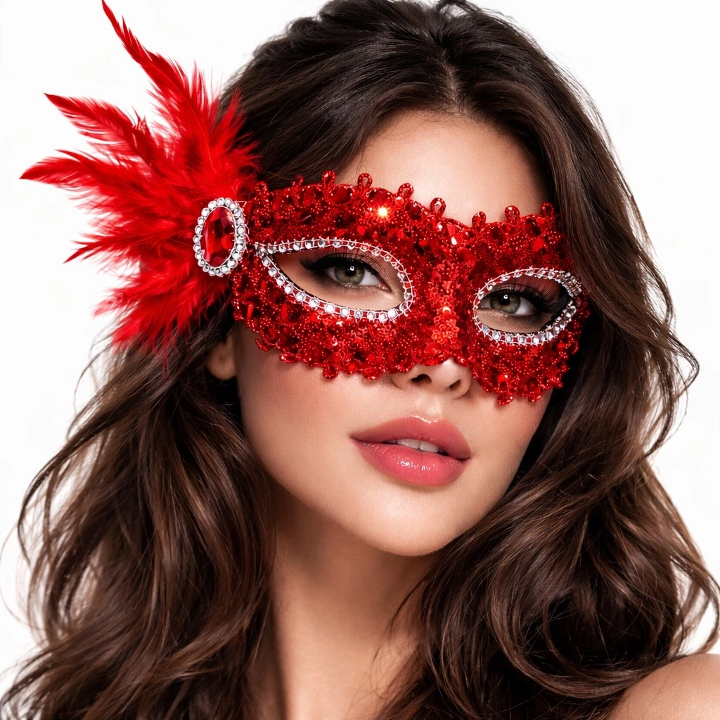 Göz alıcı kırmızı rengi ve parlak payet kaplamasıyla tasarlanan Kırmızı Tüylü Venedik Maskesi, özel gecelerde tüm dikkatleri üzerinize çekmenizi sağlar.