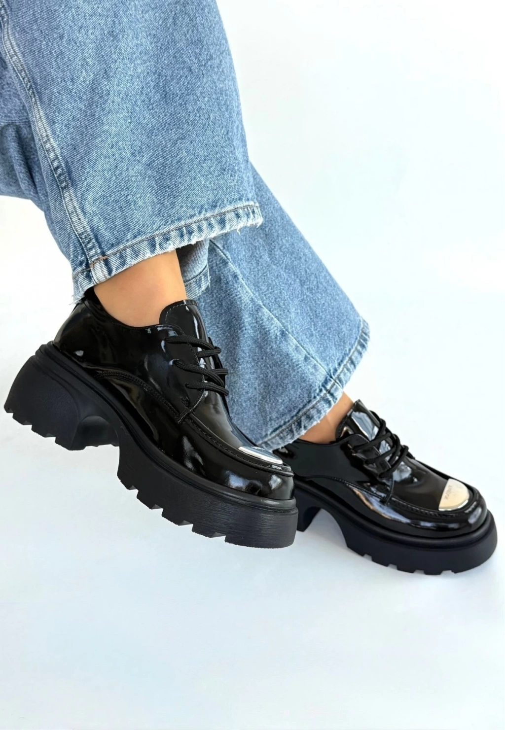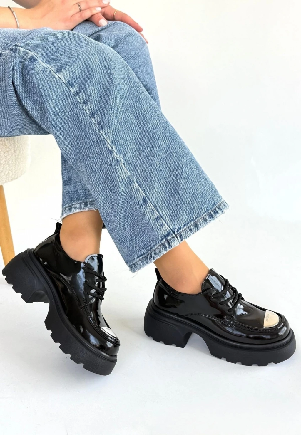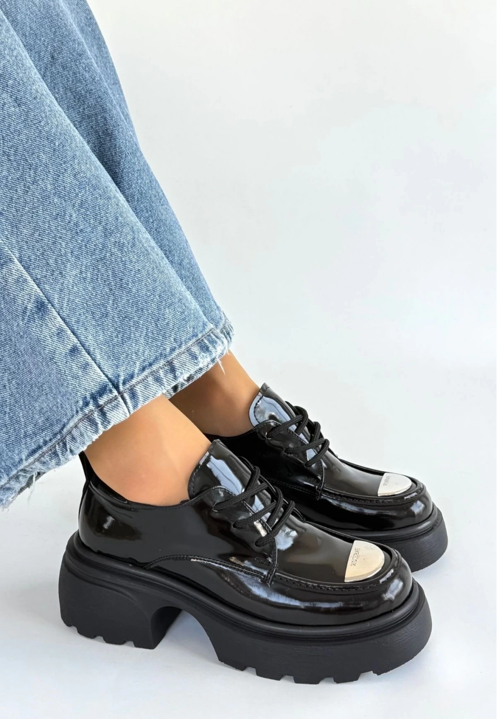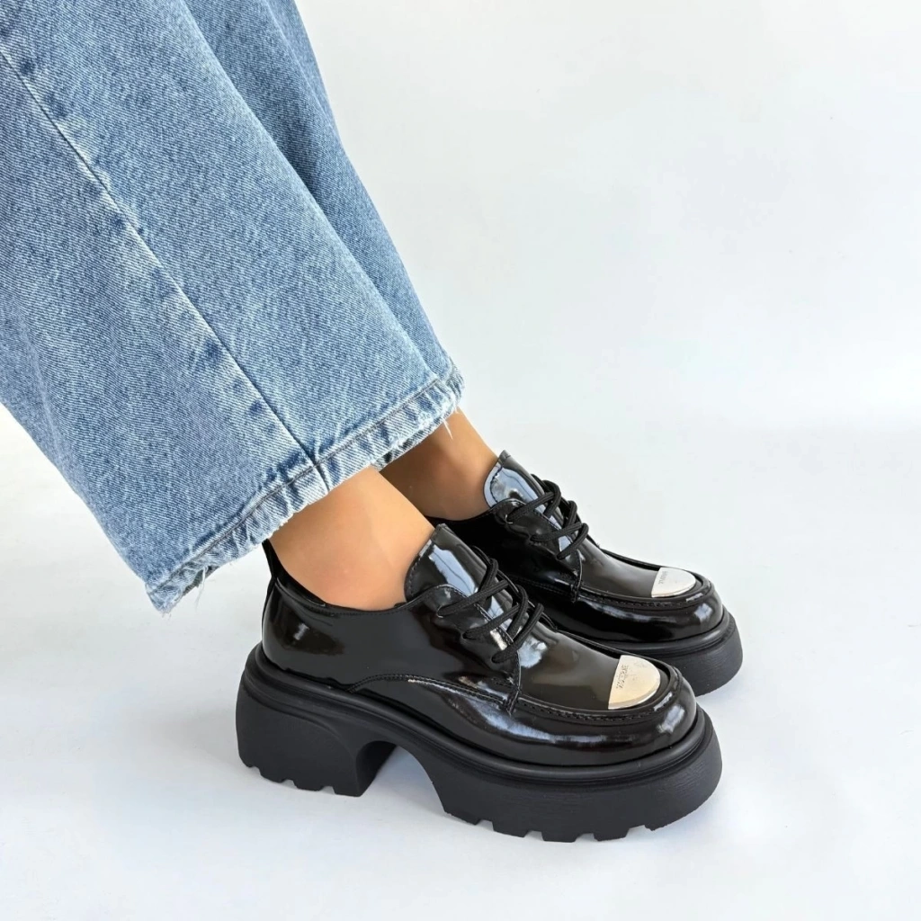 • Kiya Siyah Rugan Dolgu Topuk Oxford Ayakkabı