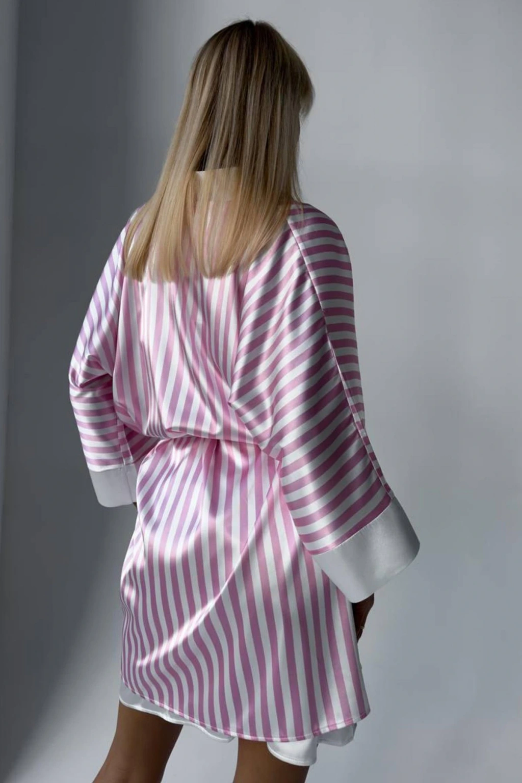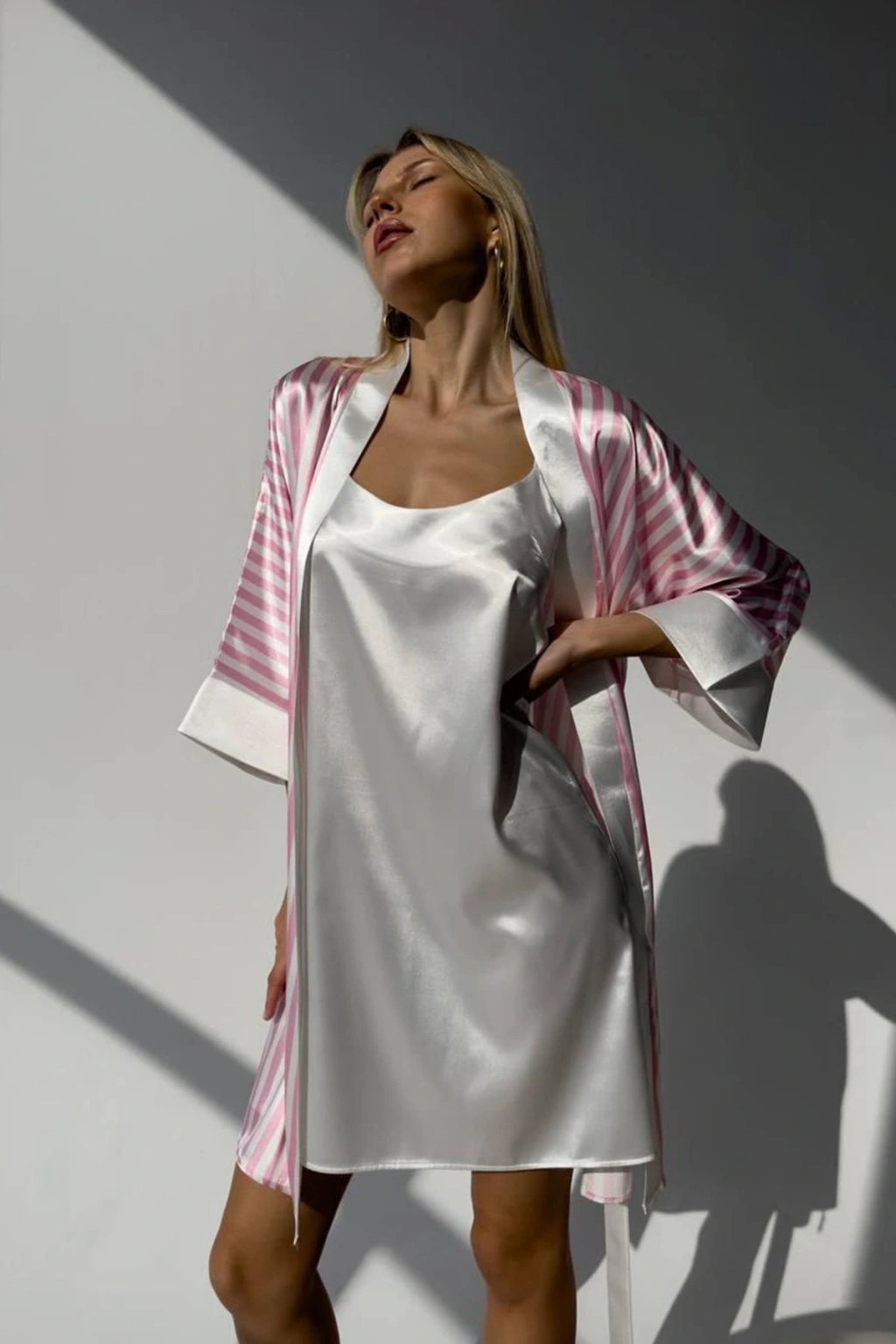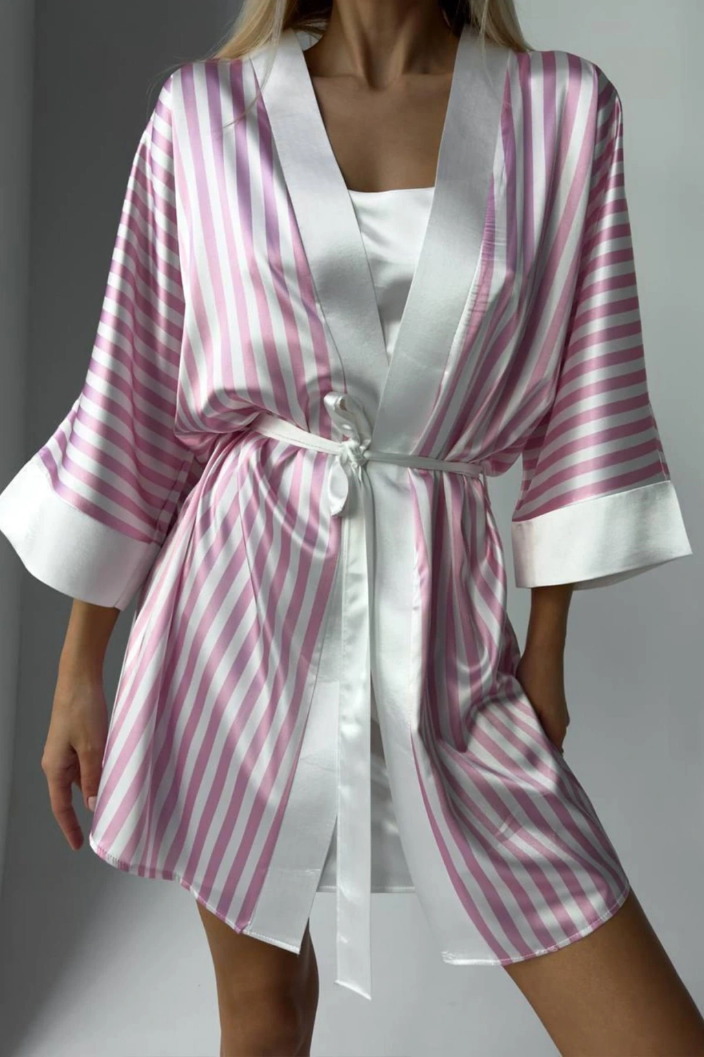 Klasik Pudra Askılı Gecelik & Pembe Çizgili Sabahlık – Zarafet ve Konforun Mükemmel Uyumu