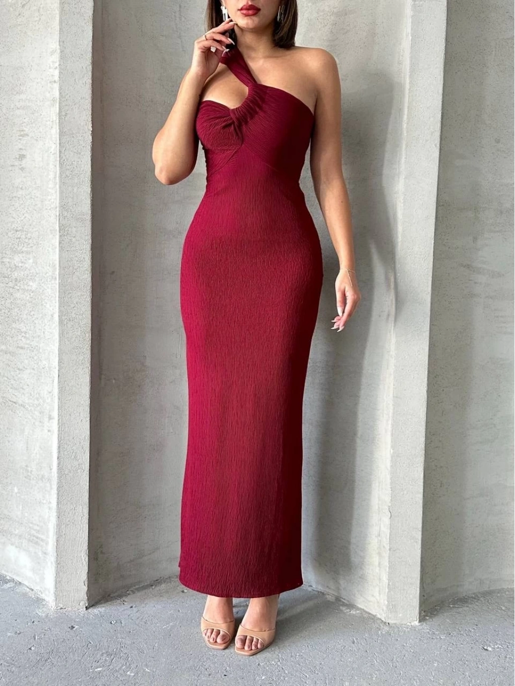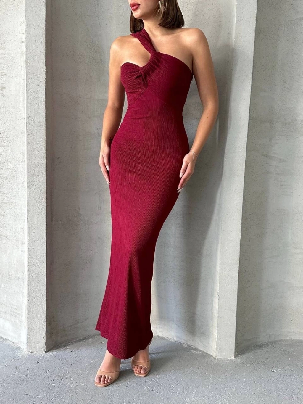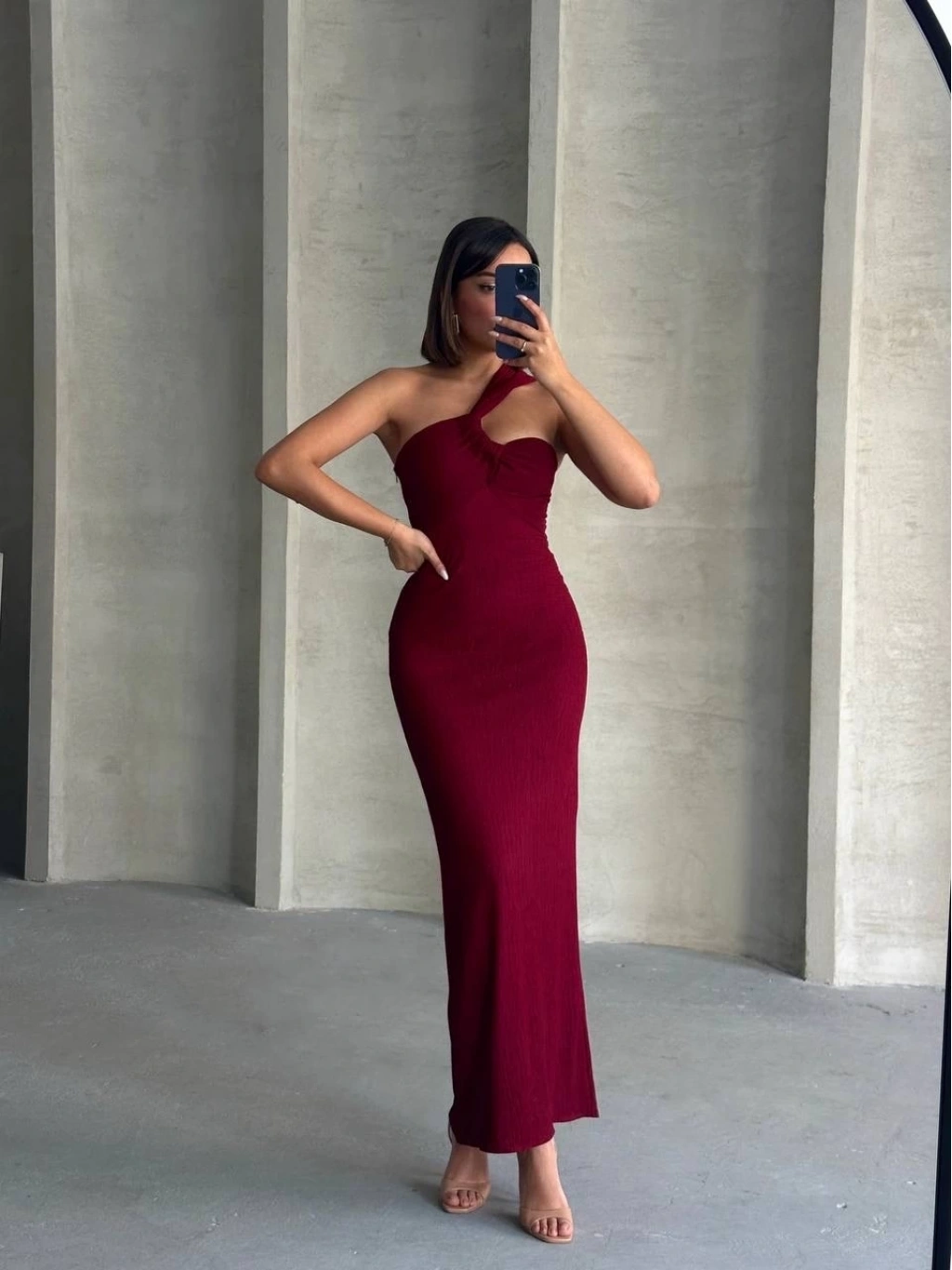 Krinkıl tek omuz uzun elbise bordo S25455, şıklık ve rahatlığı bir arada sunar.