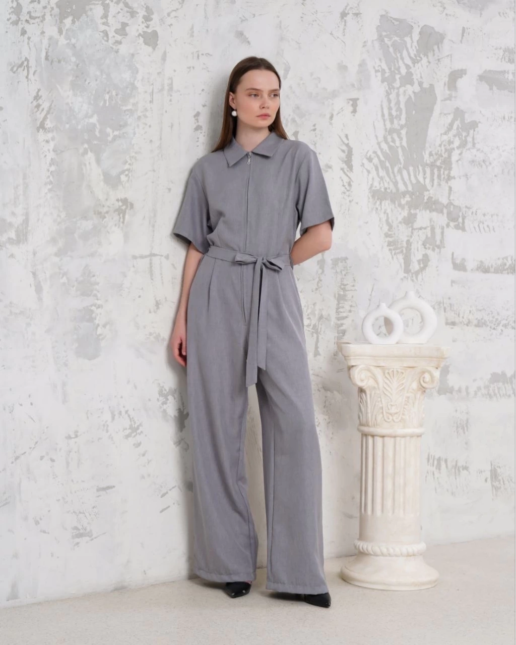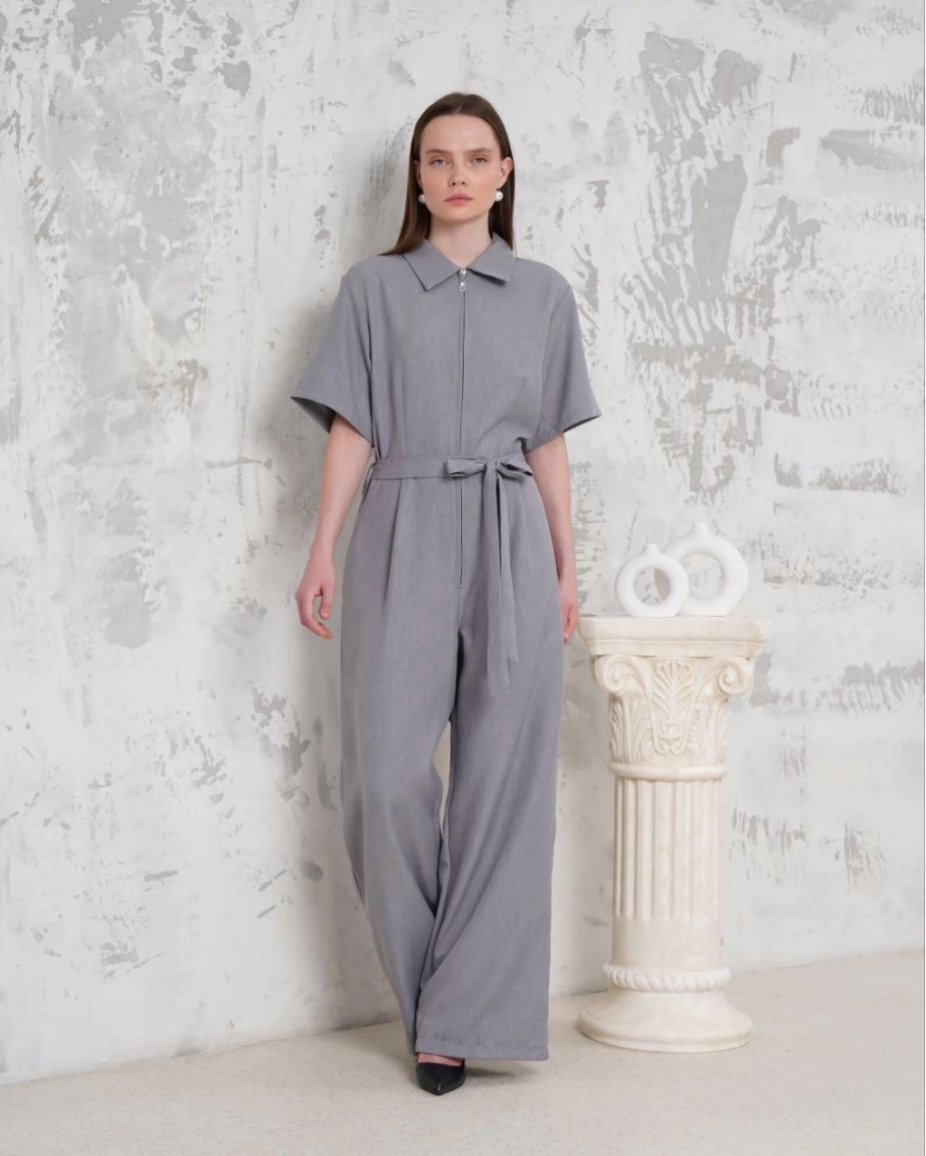 Gri kuşaklı gömlek yaka salaş tulum ile tarzınızı ortaya koyarken, gün boyu konforun keyfini çıkarın.