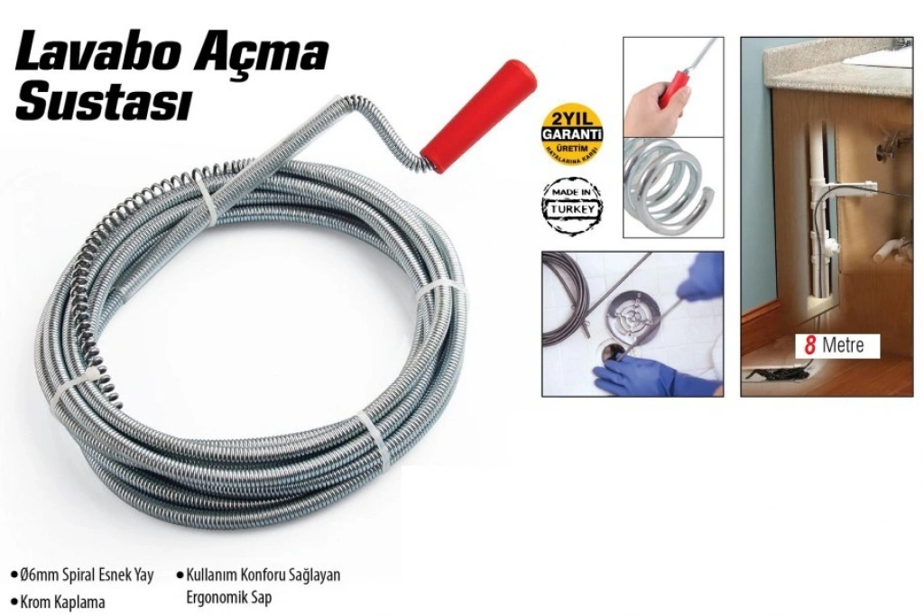 Lavabo Ve Gider Boruları Açacağı - Lavabo Açma Sustası - 8 Metre tıkalı ve dolu her çeşit sıvı , katı atık giderinin temizlenmesi için dizayn edilmiş ergonomik saplı ve kullanım kolaylığı sağlayan bir üründür.
