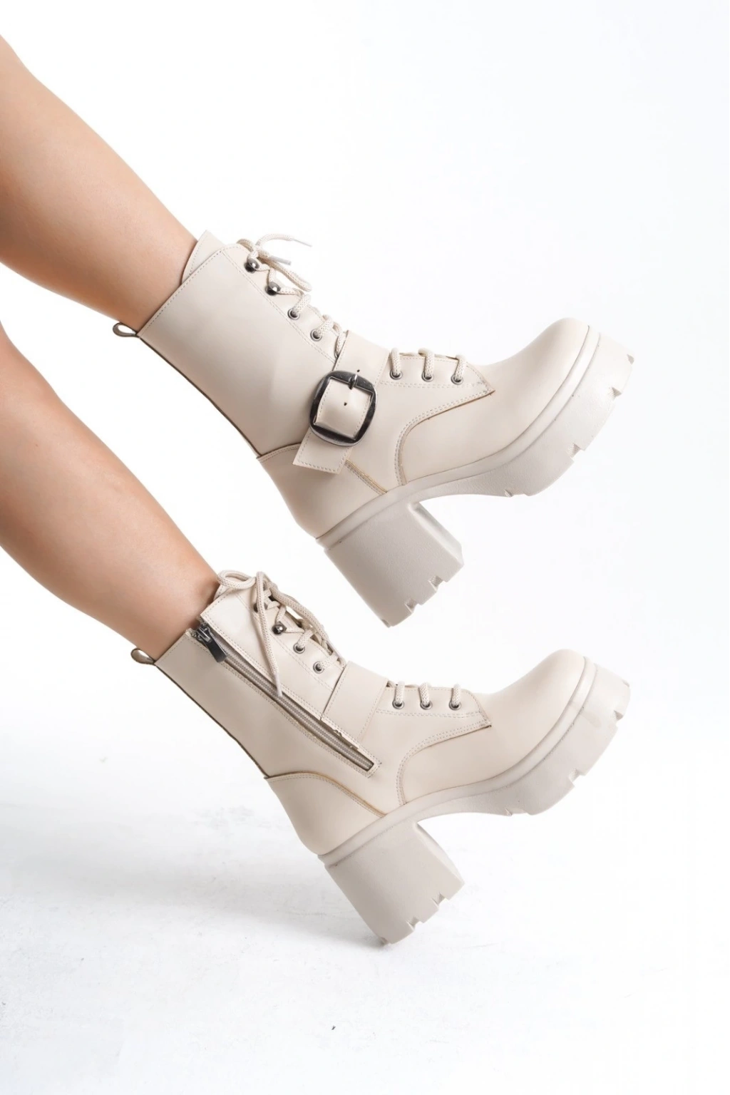• Linma Bej Cilt Bağcıklı Topuklu Bot