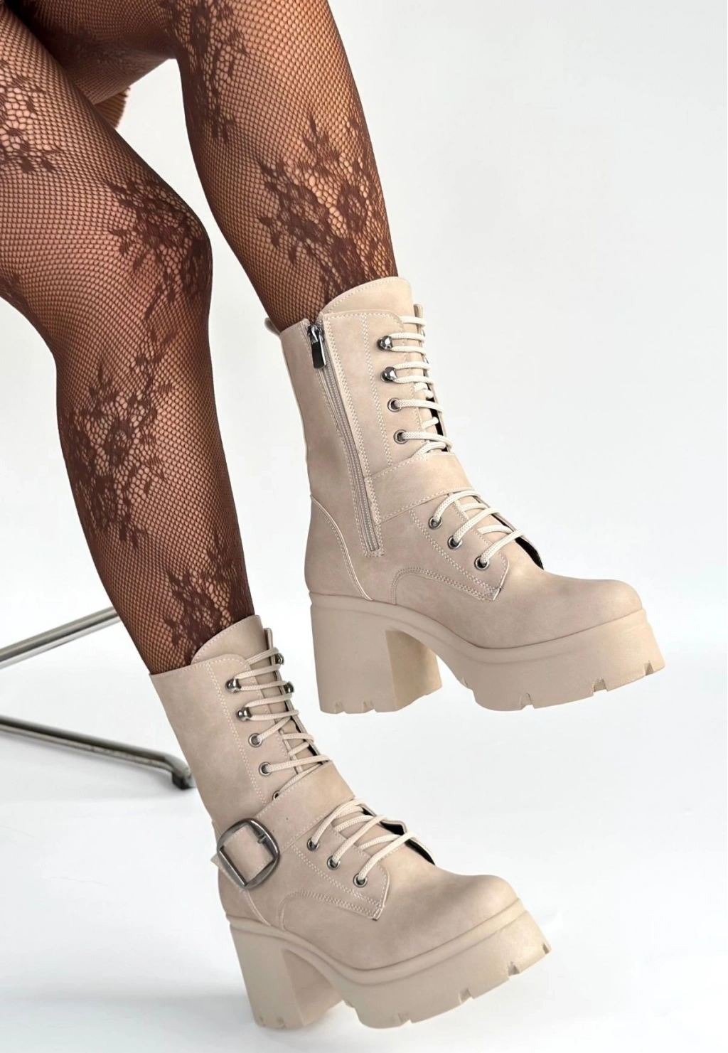 • Linma Bej Nubuk Bağcıklı Topuklu Bot