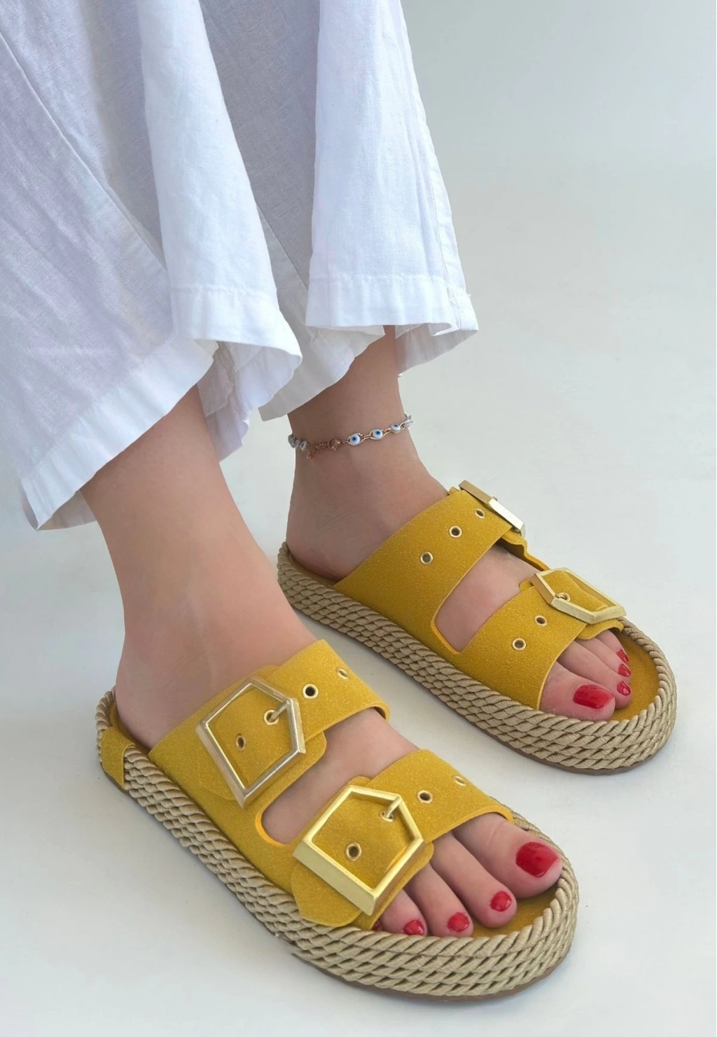 Loera Sarı Nubuk Çift Tokalı Terlik