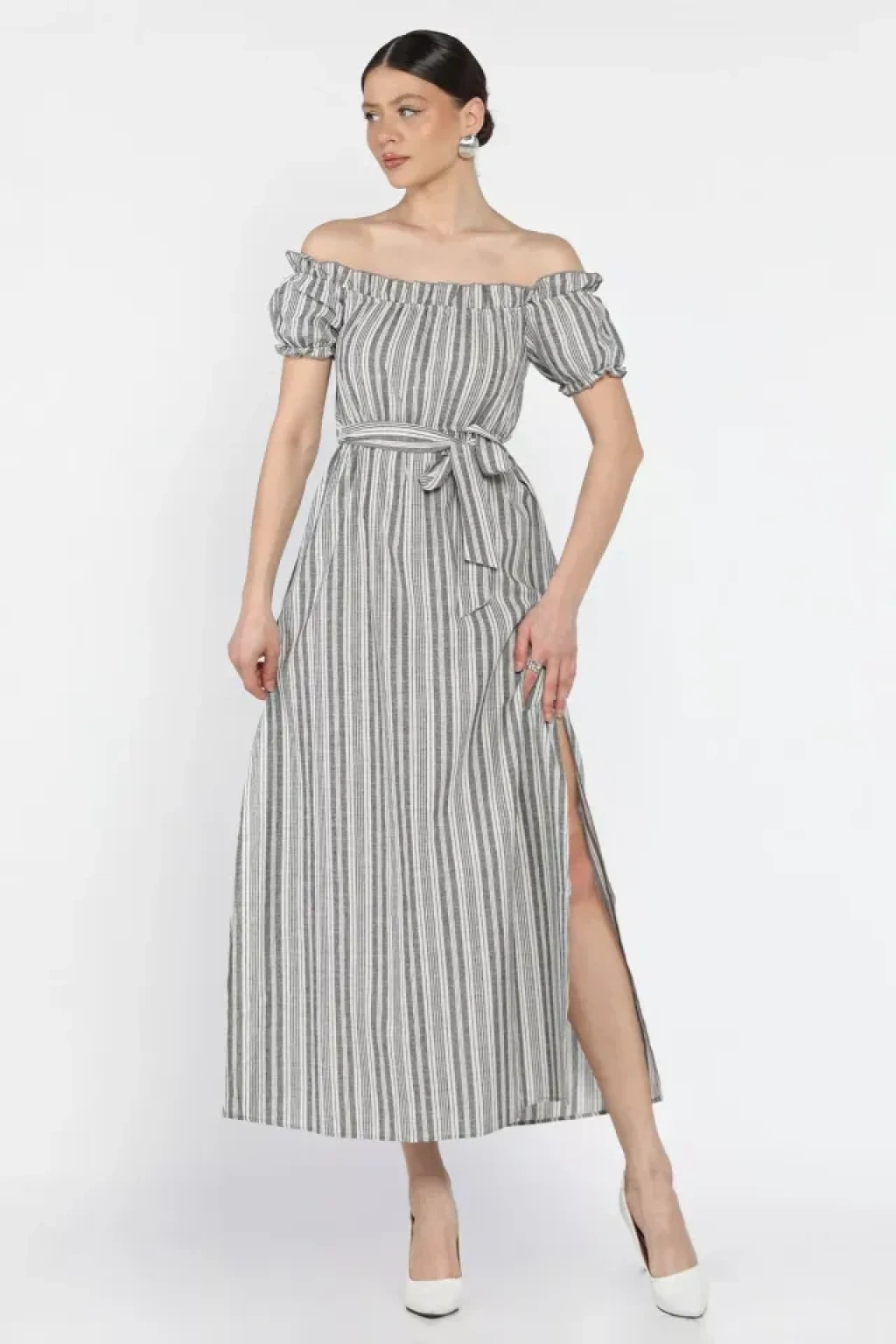 Madonna yaka midi yırtmaçlı kuşaklı keten elbise, gardırobunuzun şıklığını tamamlayacak bir parçadır.