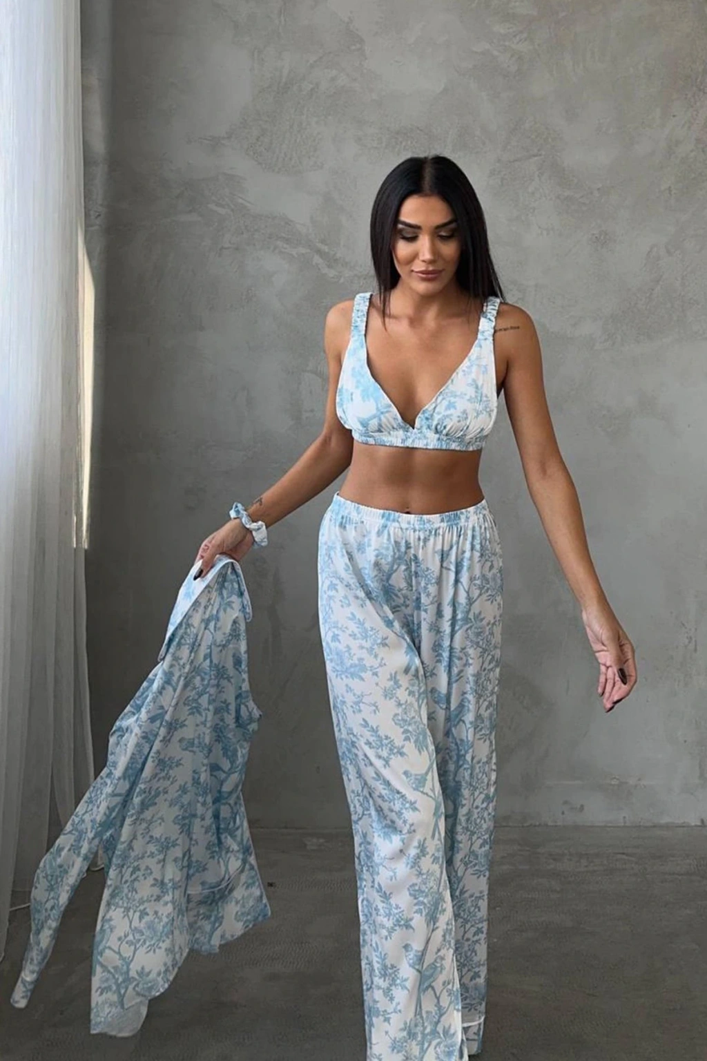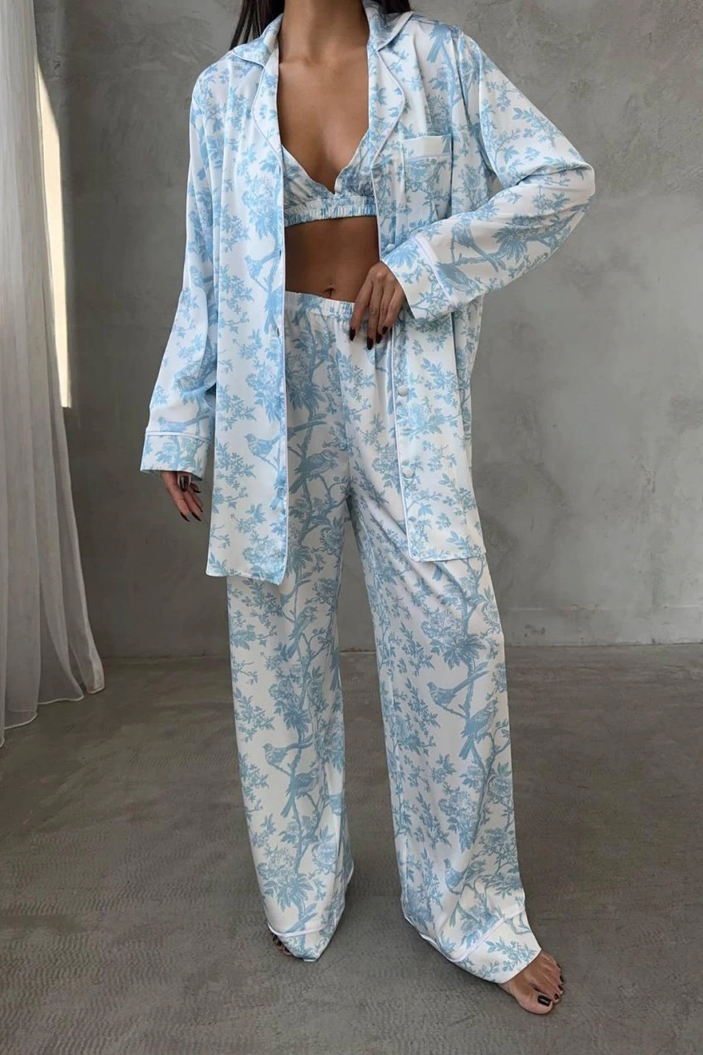 Zarafeti ve konforu bir araya getiren Mavi Kuş Dijital Baskılı Uzun  Saten Üçlü Pijama Takımı, hem ev giyiminizde şıklığı hem de rahatlığı ön planda tutanlar için özel olarak tasarlandı. Yumuşak dokusuyla cildinizi şımartan saten kumaşı, lüks hissiyatı ile sizi buluşturuyor.