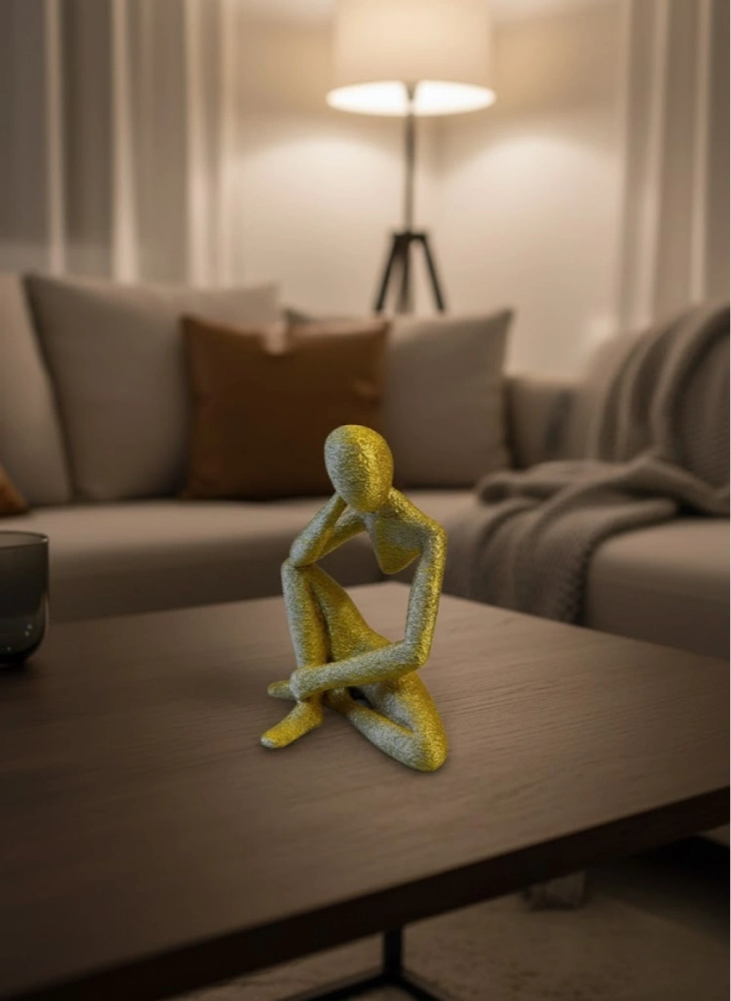 Sarı insan figürü biblo, düşünceli duruşu ve yalın tasarımıyla dekorasyona karakter katar. Küçük boyutları sayesinde dar alanlarda bile estetik bir tamamlayıcı olarak tercih edilebilir. Evde, ofiste veya çalışma alanlarında masa üstü ya da raf dekoru olarak kullanılabilir. Loş ya da aydınlık ortamlarda şık bir duruş sergileyerek mekâna modern bir hava kazandırır.