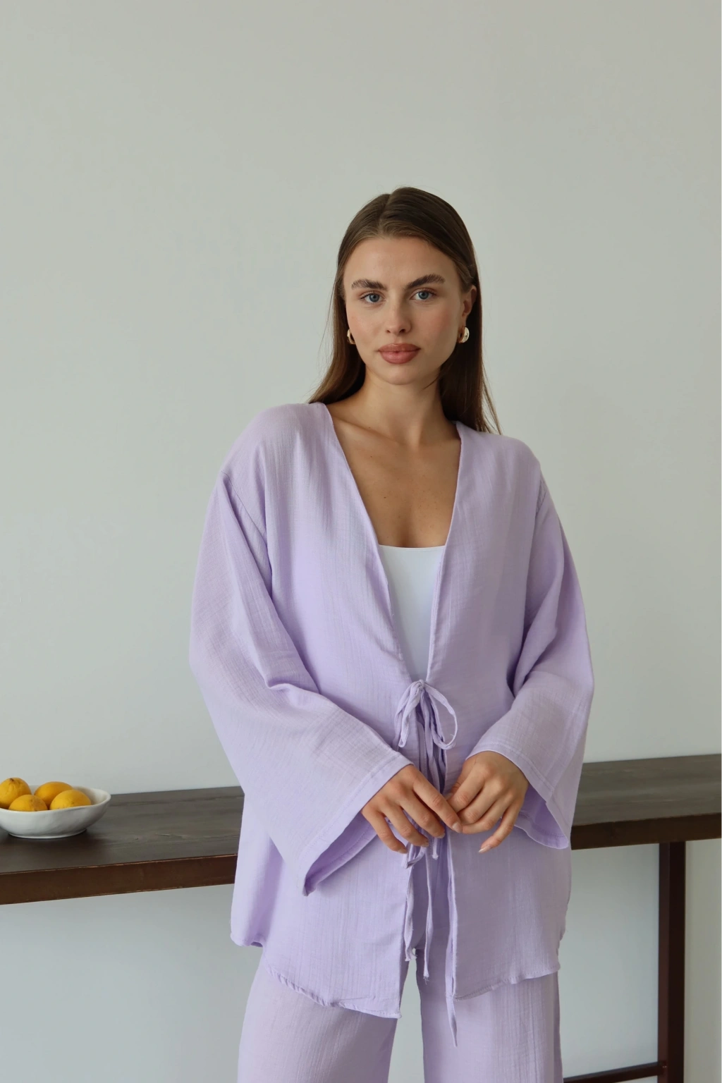 Sezonun trendi olan lila rengiyle şıklığı ve rahatlığı bir arada sunan Müslin Kumaş Kimono ile tarzınızı konuşturun!