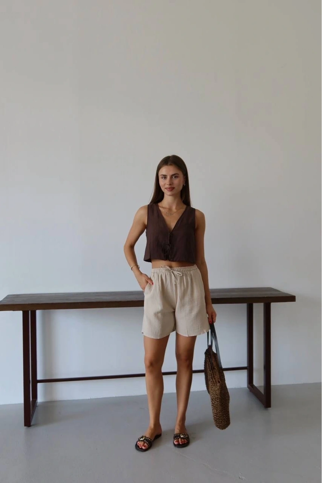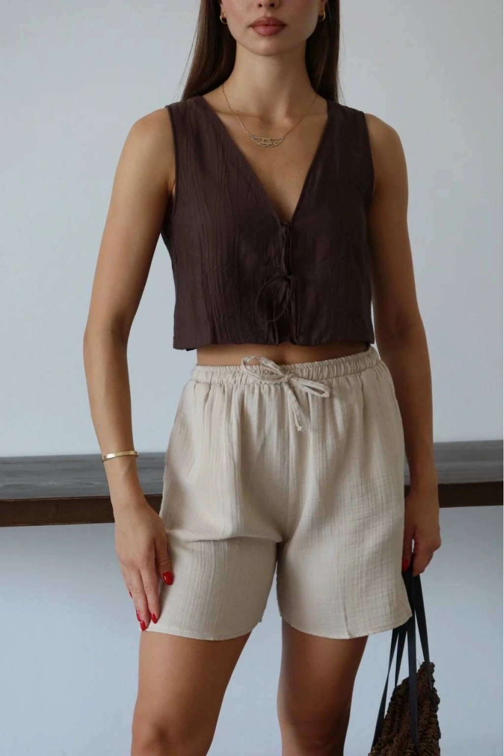 Bu bağcıklı bej şort, hem şık hem de rahat bir seçenektir. Müslin kumaştan üretilmiş olan bu şort, yaz aylarında vazgeçilmeziniz olmaya aday. İster günlük kombinlerinizde ister plajda şık bir alternatif arıyorsanız, bu şort tam size göre!