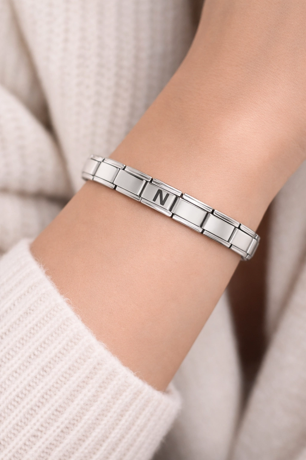 N harfli çelik bileklik, sade ve zarif tasarımıyla stilinize anlamlı bir dokunuş katar.