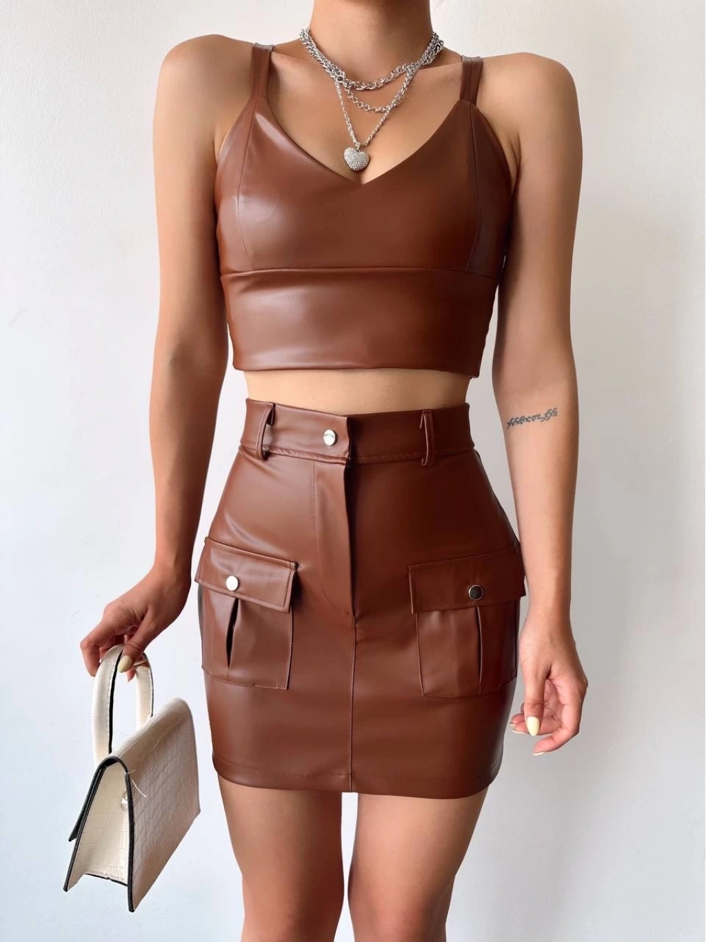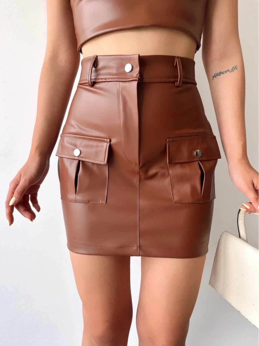 Önden iki cepli deri etek kahve h240040