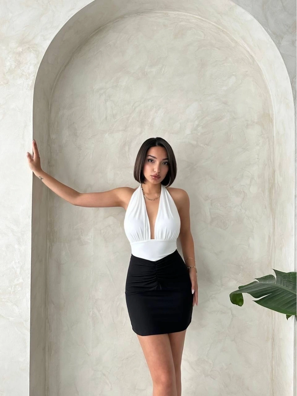 Bel kısmındaki detaylar sayesinde vücudu saran bir kesime sahip olan etek, şıklığınızı ön plana çıkarır.