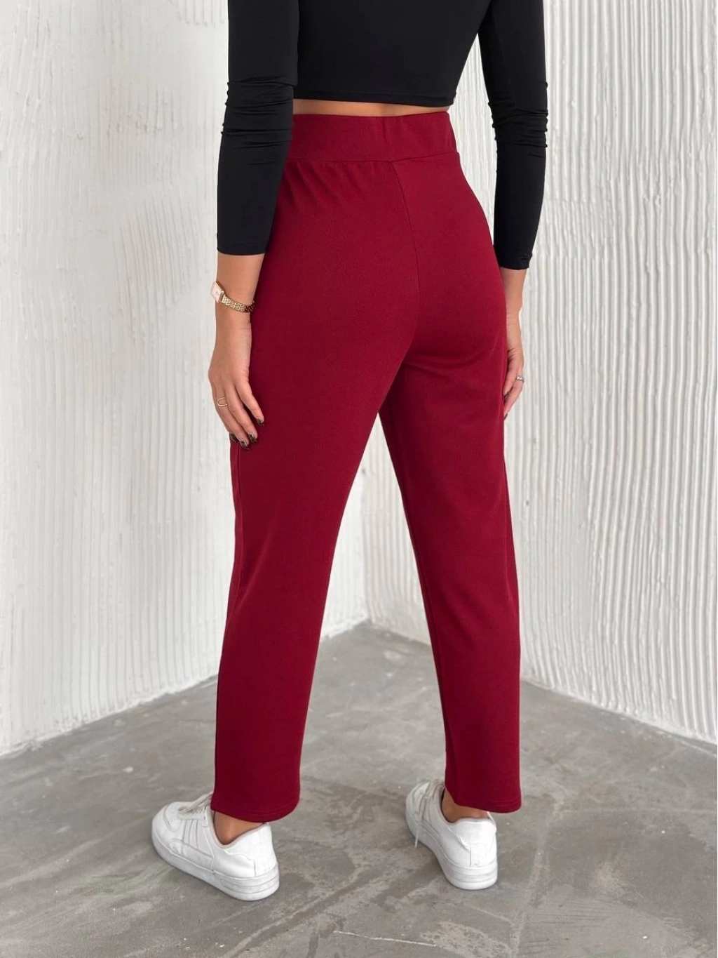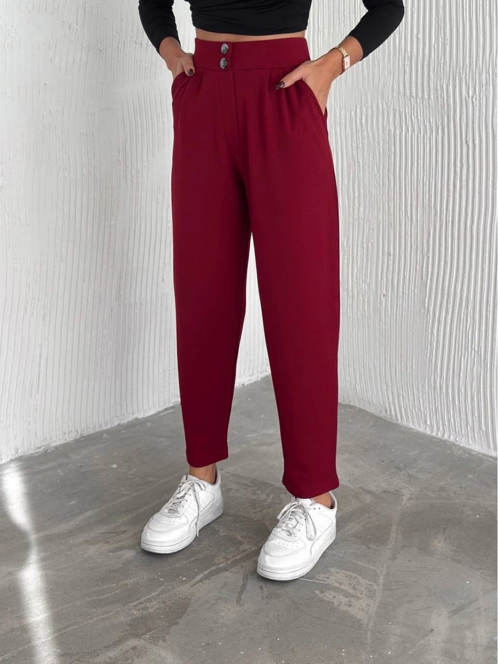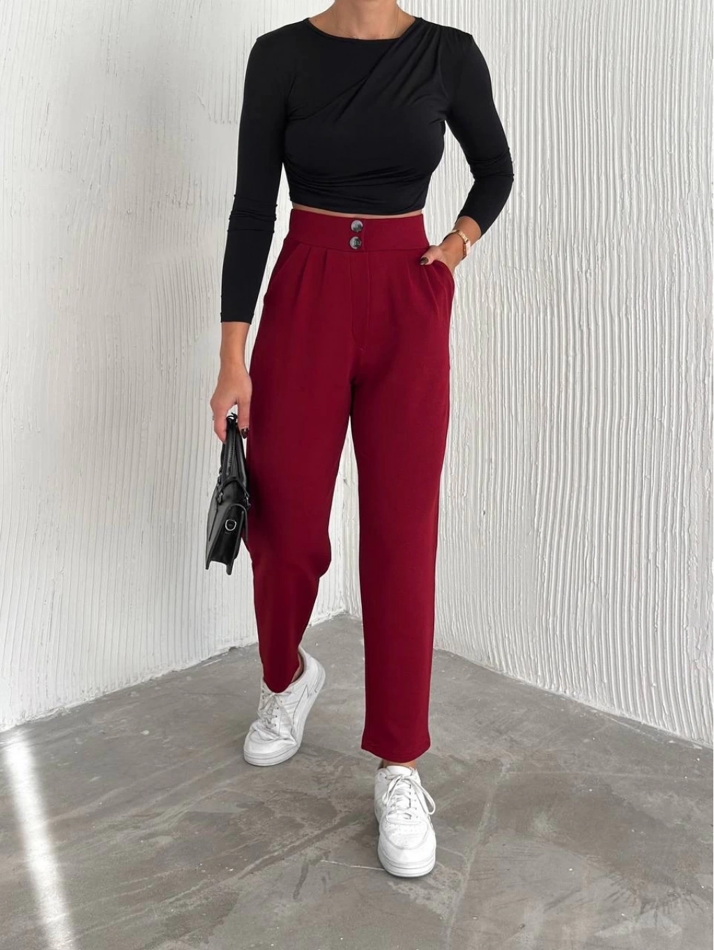 örme krep pantolon çift düğmeli modeli, şıklığı ve konforu bir arada sunar.