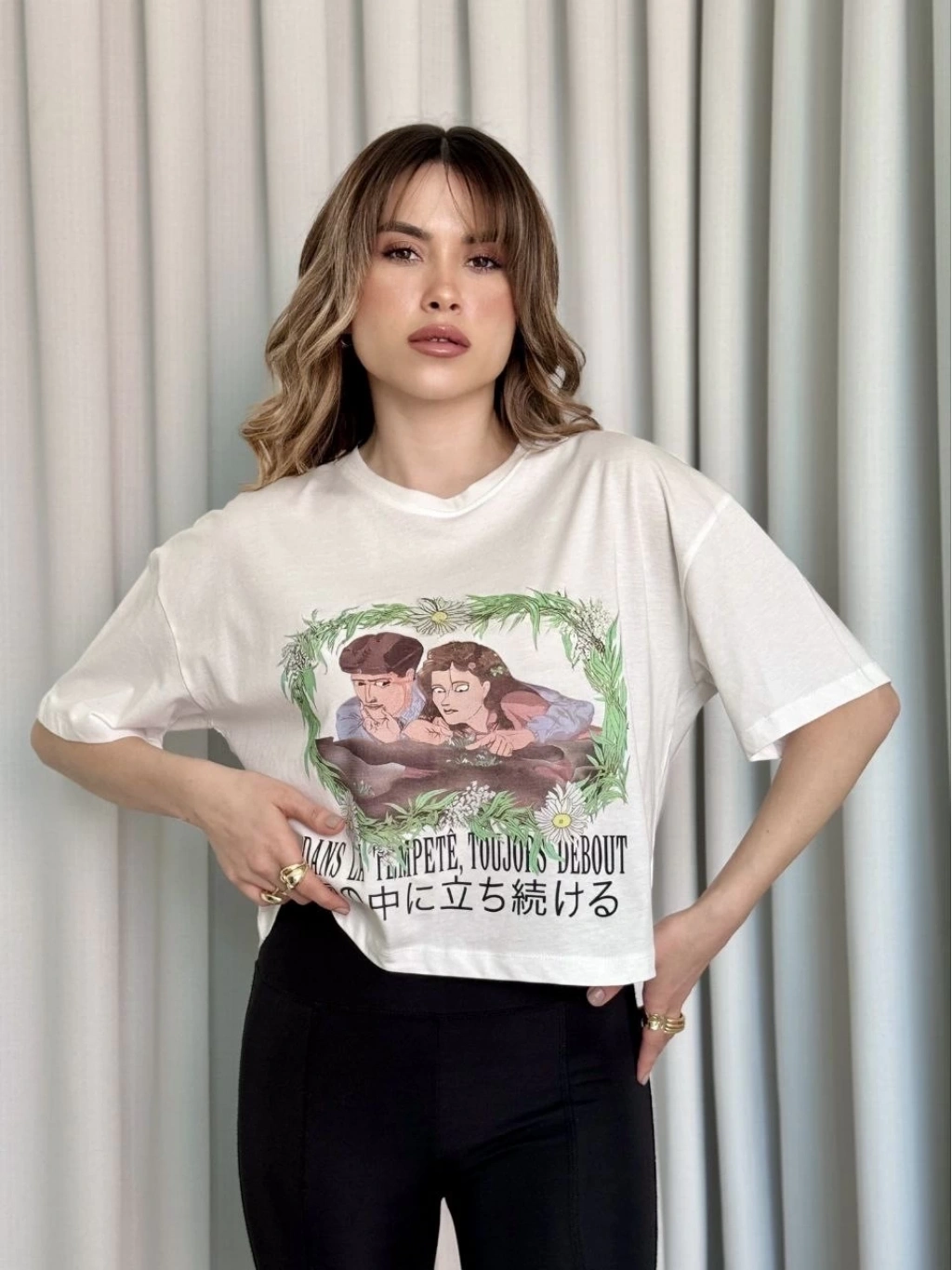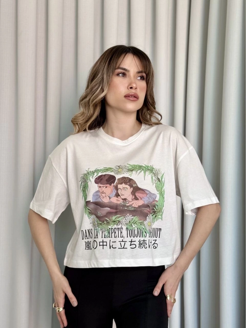 • Oversize Beyaz baskılı crop tişört