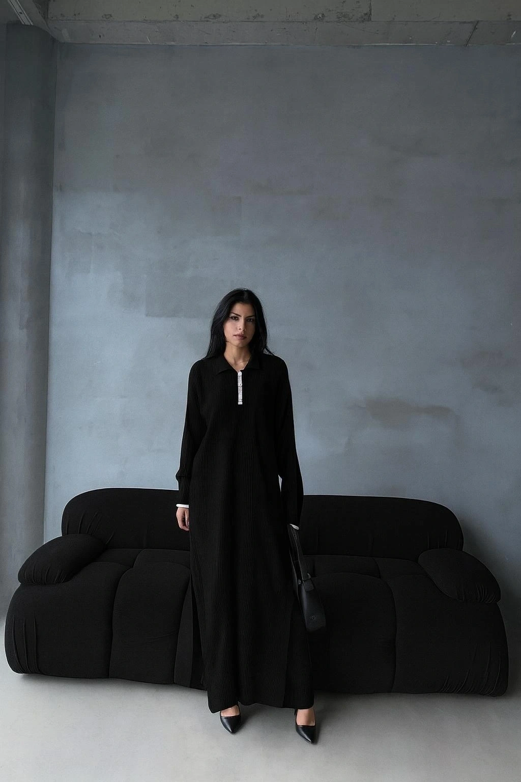 Siyahtan vazgeçemeyenlerin favorisi olacak Siyah Elf Pantolon Yırtmaçlı Elbise İkili Triko Takım, hem şık hem de trendy görünmek isteyen kadınların tercihi olacak.