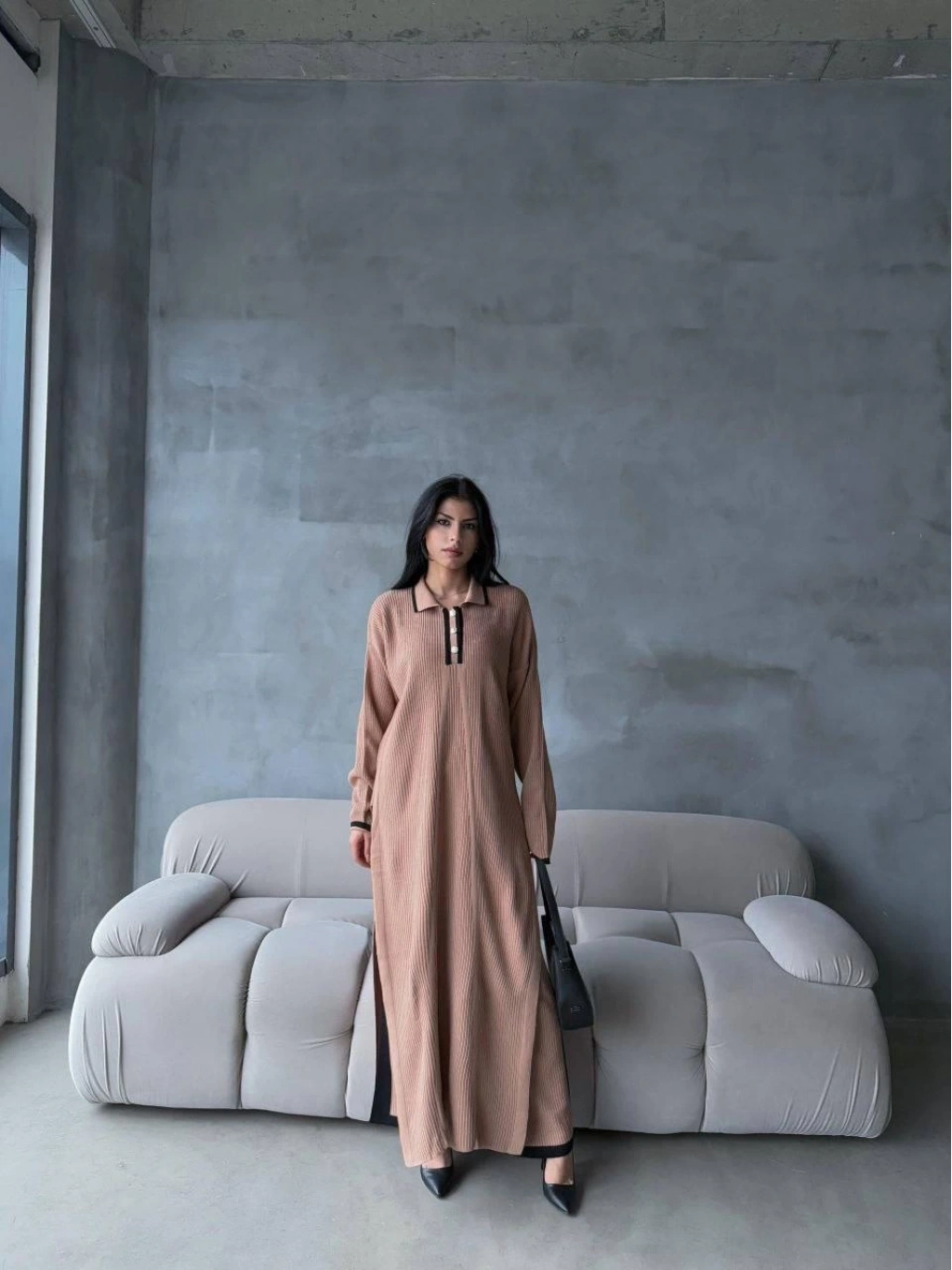 • Pantolon yırtmaçlı elbise ikili triko takım vizon elf
