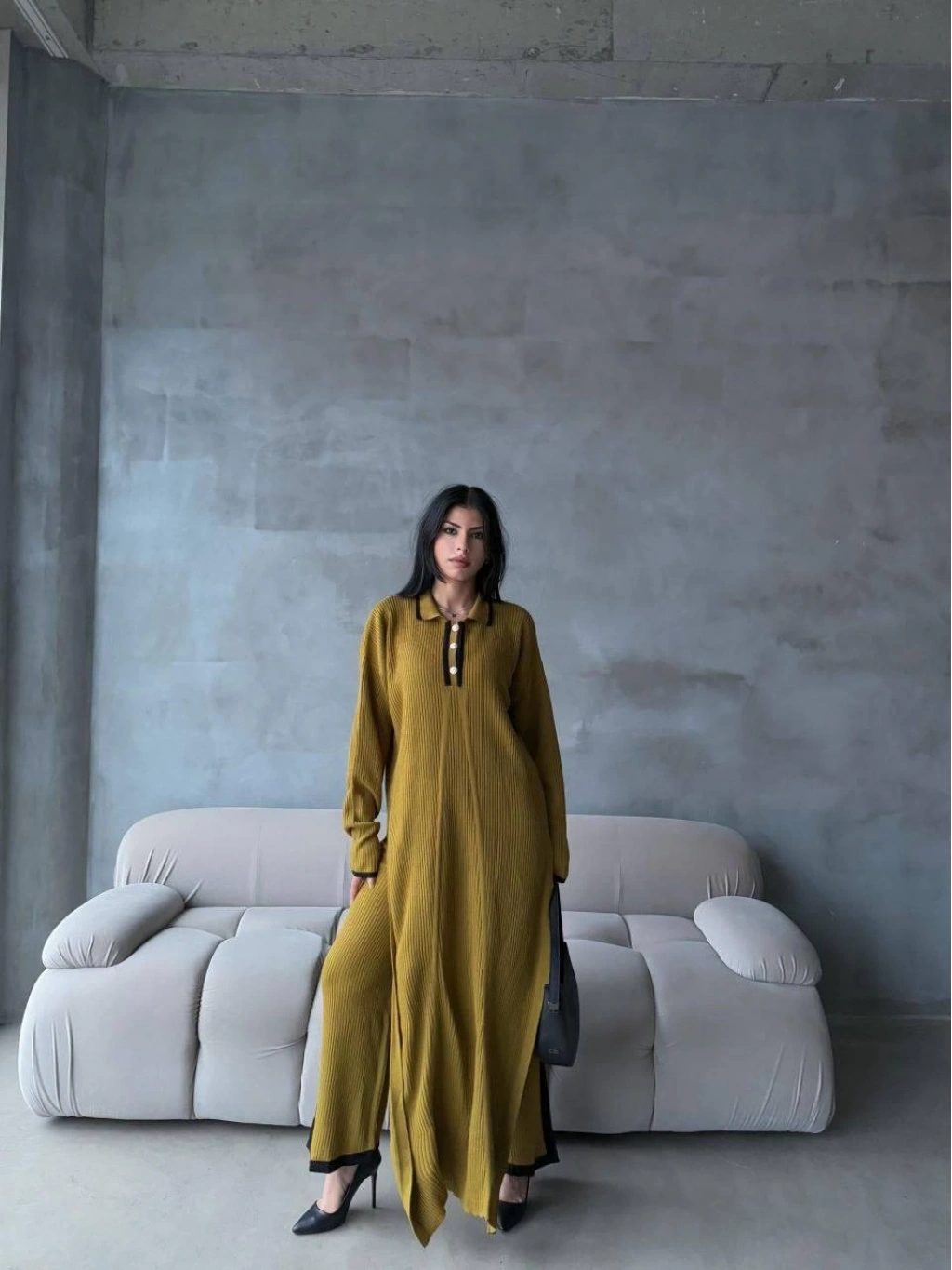 Kıyafetlerinizde fark yaratmaya hazır mısınız? Pantolon yırtmaçlı elbise ikili triko takım yeşil elf ile şıklığı ve tarzı bir arada bulacaksınız. Bu takım, cesur tasarımıyla göz kamaştırıcı bir görünüm sunuyor.