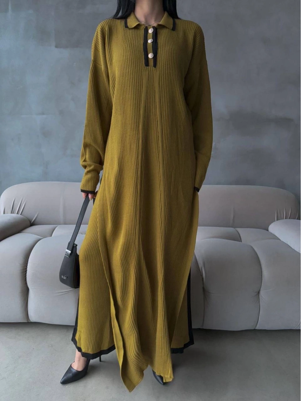 • Pantolon yırtmaçlı elbise ikili triko takım yeşil elf