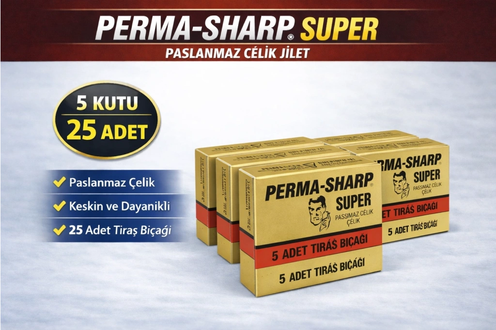 perma sharp jilet, perma sharp super 5li, 5 li jilet kutusu, 20 kutu perma sharp, 100 adet jilet, paslanmaz çelik jilet, berber jileti, geleneksel tıraş bıçağı, ustura jileti, profesyonel jilet, ekonomik jilet paketi, klasik tıraş jileti, keskin jilet