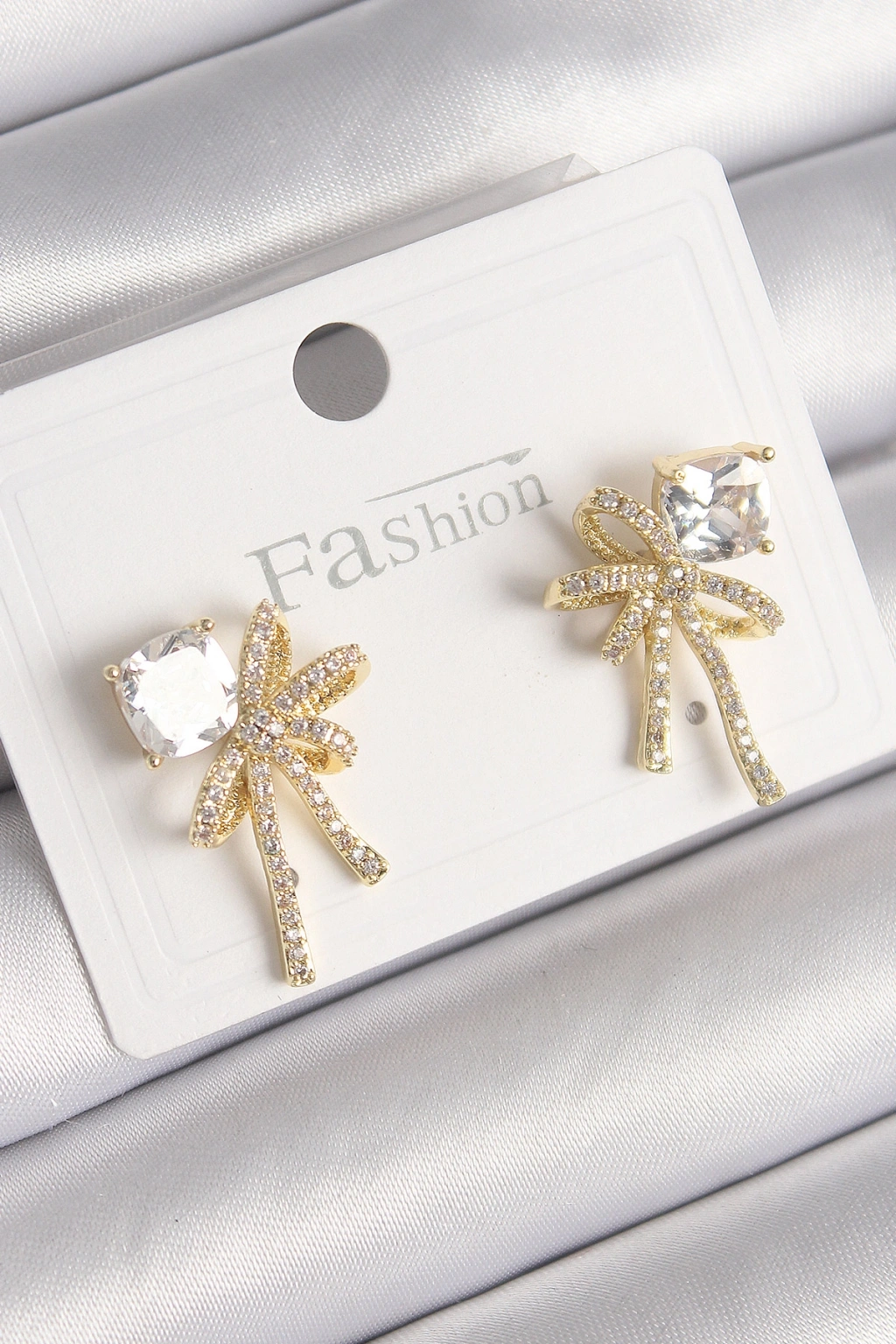 Pirinç Gold Renk Zirkon Taşlı Kurdele Model Kadın Küpe