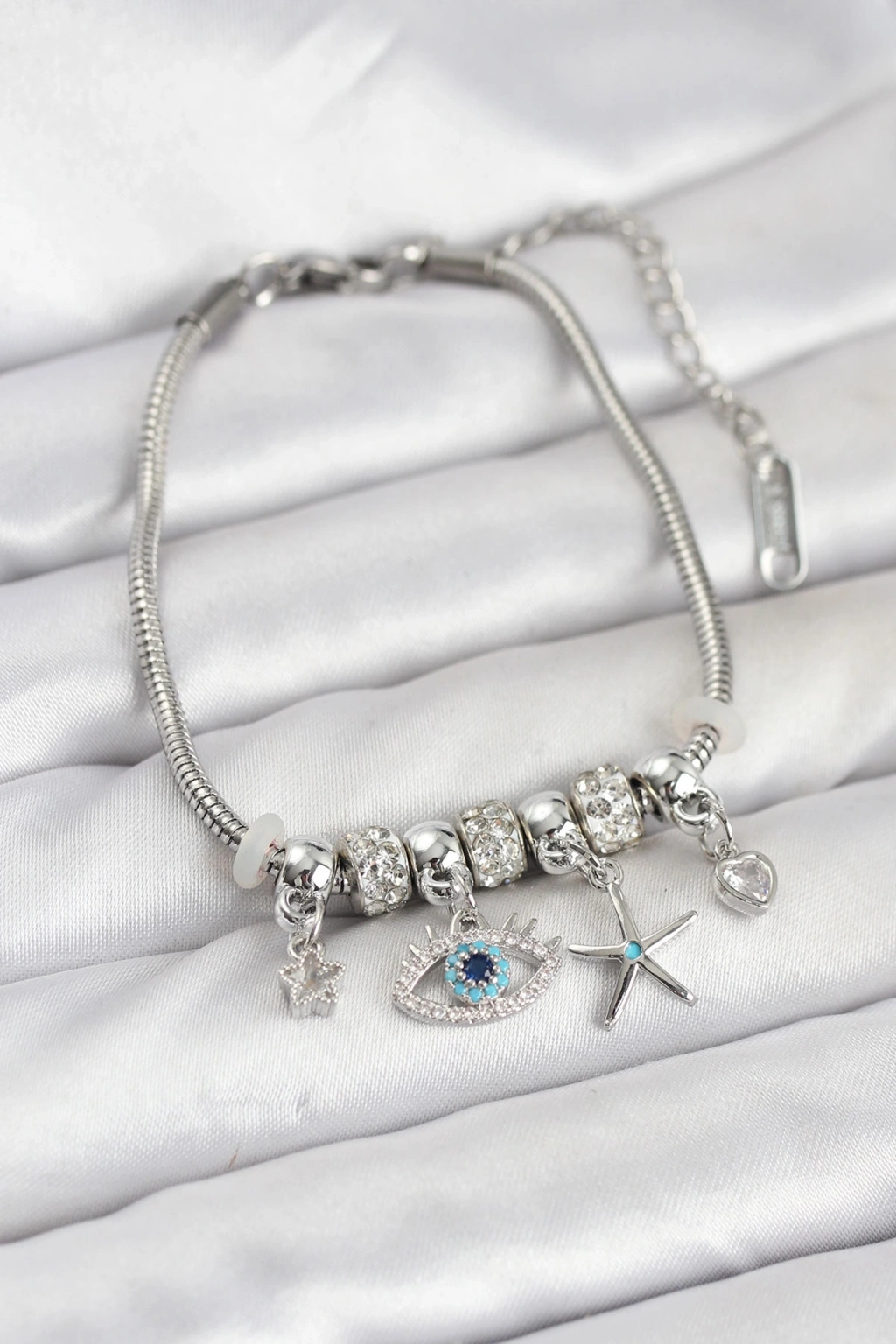 Pirinç Gümüş Renk Göz Model Charmlı Kadın Bileklik