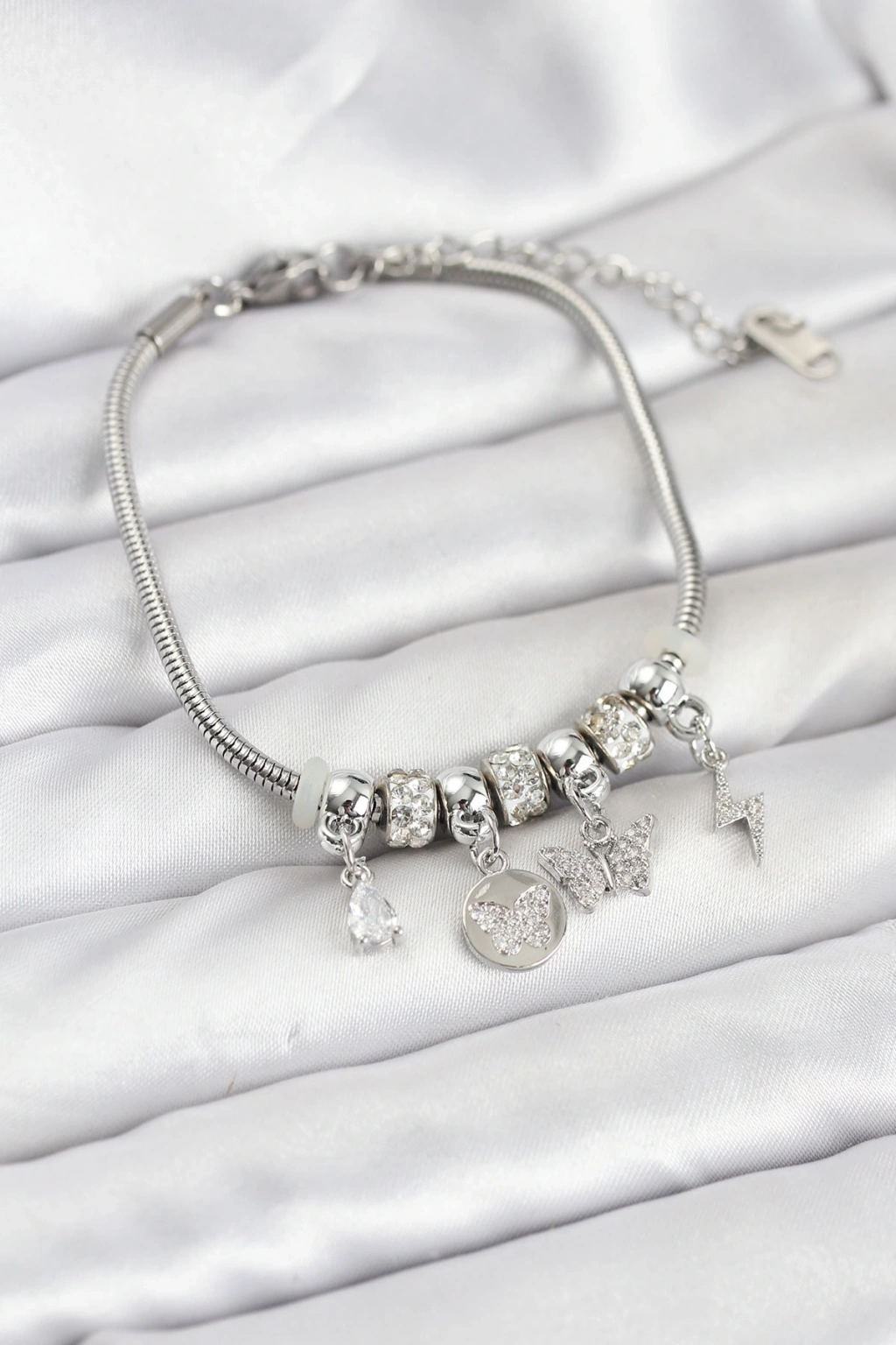 Pirinç Gümüş Renk Kelebek Charmlı Kadın Bileklik
