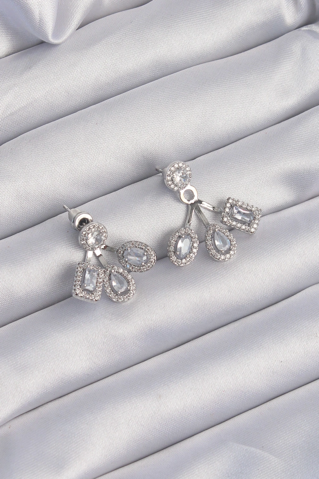 Pirinç Gümüş Renk Zirkon Taşlı Geometrik Model Küpe