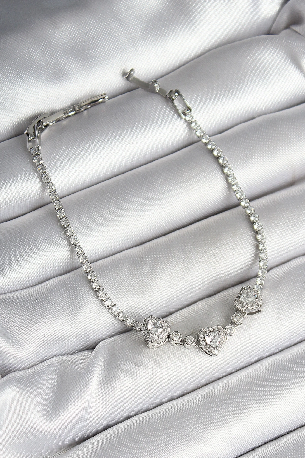 Pirinç Sıralı Kalp Figürlü Zirkon Taşlı Gümüş Renk Kadın Bileklik