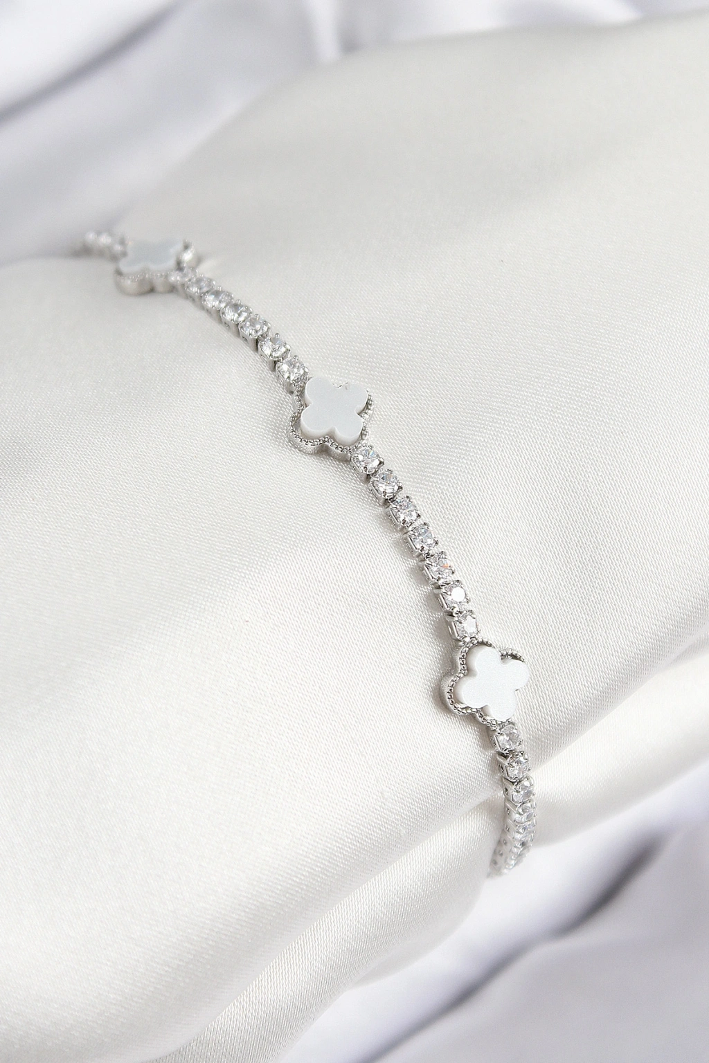 Pirinç Zirkon Taşlı Yonca Model Gümüş Renk Kadın Bileklik