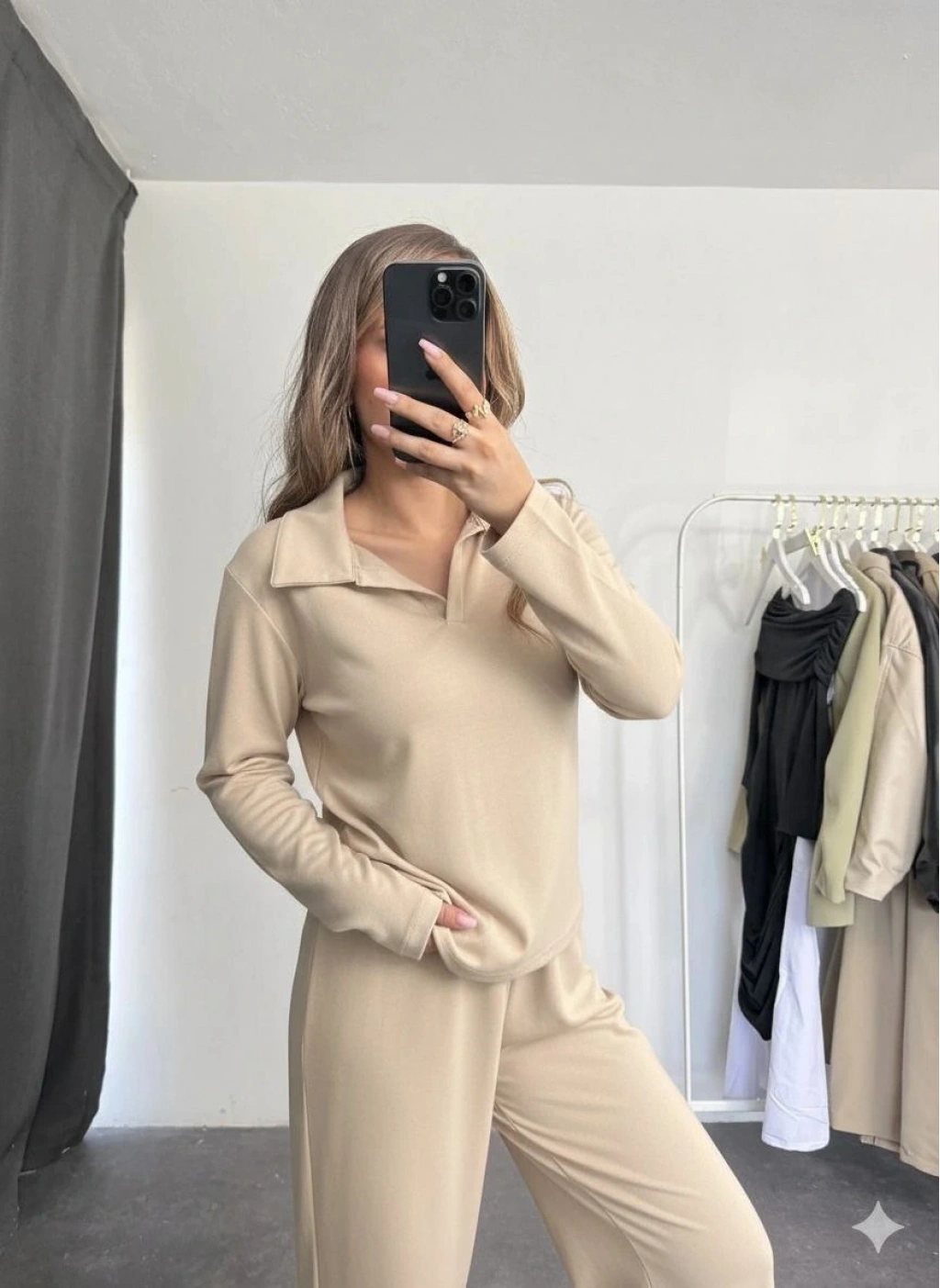 • Polo yaka alt üst kollu modal takım bej pt