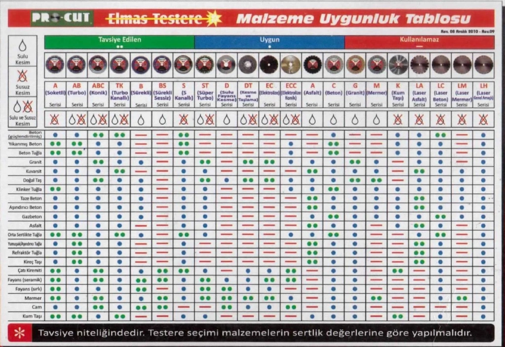 Yıkanmış beton, Beton tuğla, Orta sertlikte tuğla, Yumuşak-Aşındırıcı tuğla, Refraktör tuğla, Kireç taşı, Kum Taşı