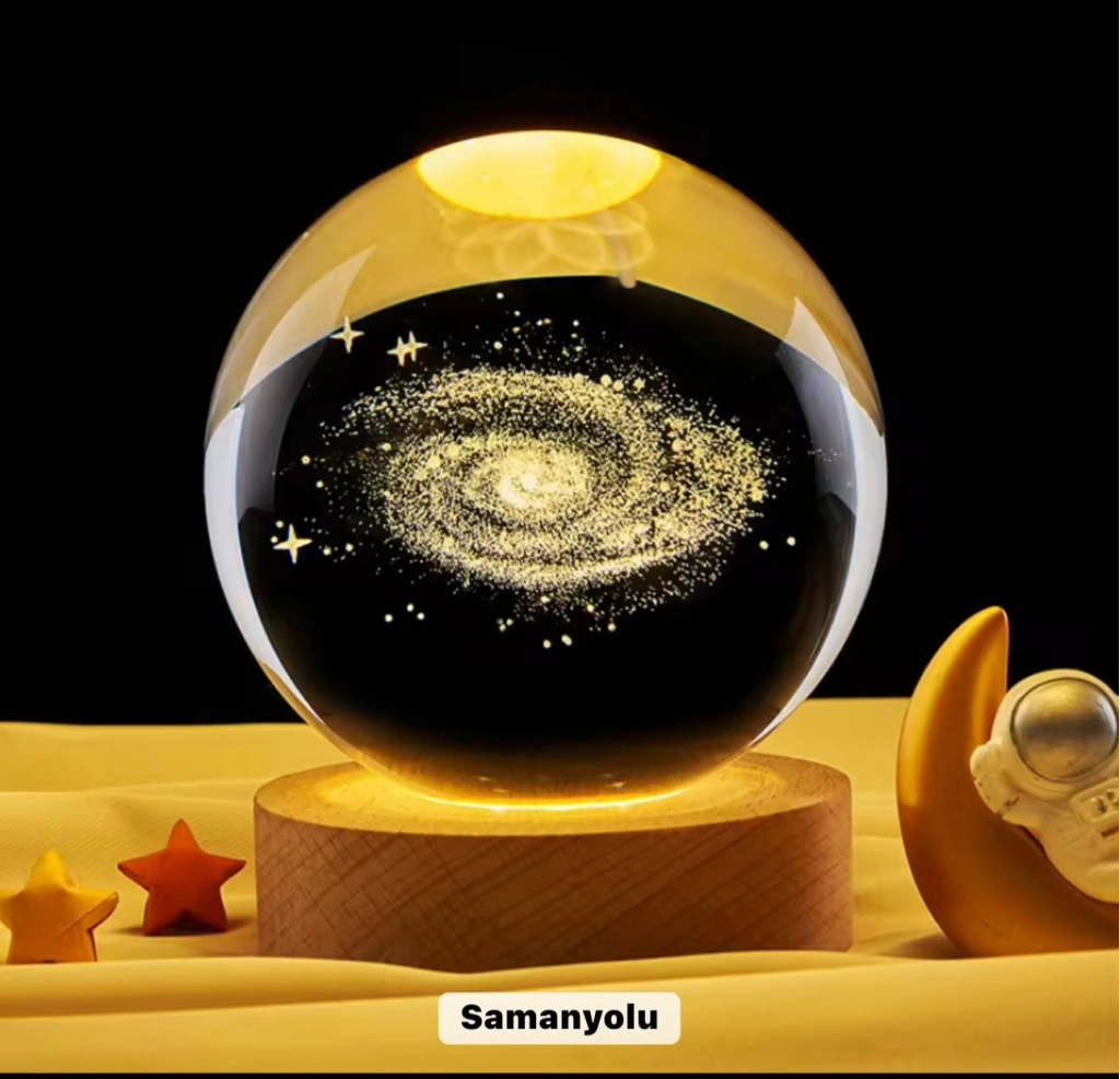 Samanyolu temalı bu kristal küre, astronomi ve uzay meraklıları için koleksiyonluk bir ürün niteliği taşır. Derinlik hissi veren 3D lazer işleme sayesinde gerçek bir galaksi efektine sahiptir. Ahşap standın doğal dokusu ile kristalin parlaklığı birleşerek hem sanatsal hem dekoratif bir görünüm sunar. Sevdiklerinize verebileceğiniz anlamlı ve şık bir hediye alternatifi olarak öne çıkar.