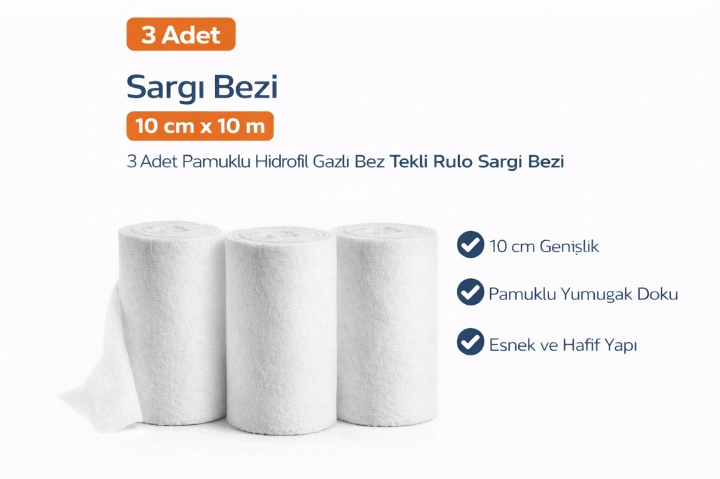 Sargı Bezi 10 cm x 10 m 3 Adet Pamuklu Hidrofil Gazlı Bez Tekli Rulo Sargı Bezi Seti