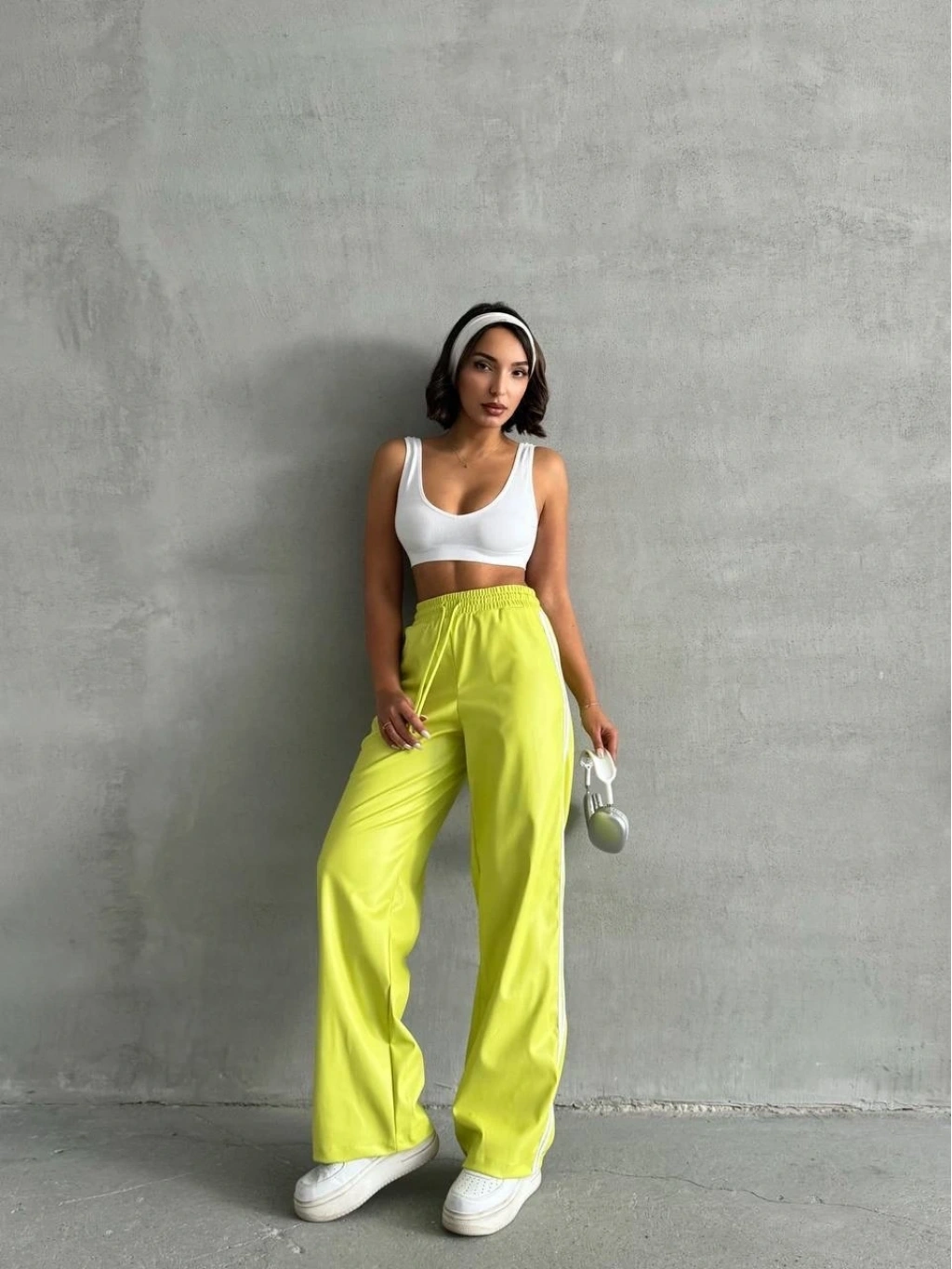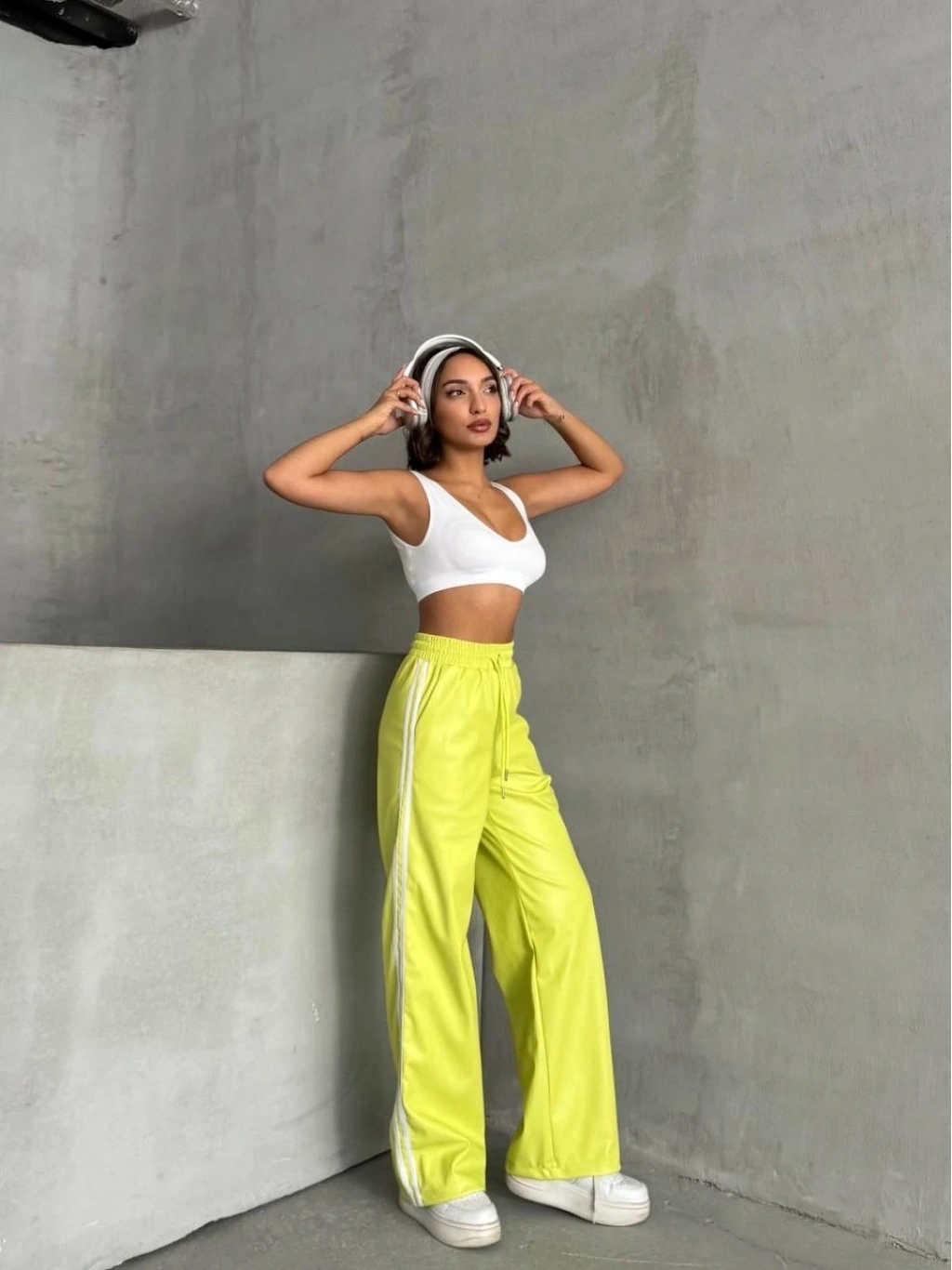 Şıklığı ve rahatlığı bir arada sunan yeşil şeritli deri pantolon h26430, gardırobunuzun favori parçası olmaya aday.